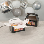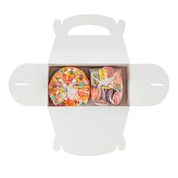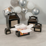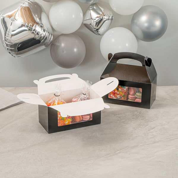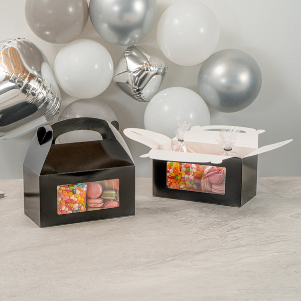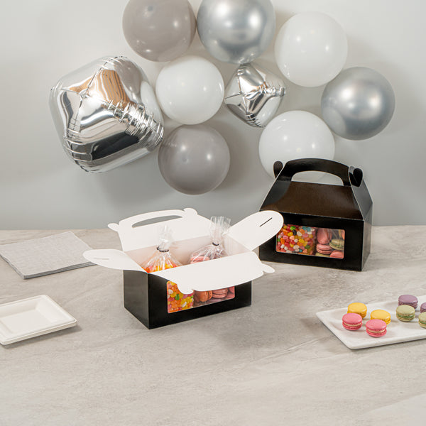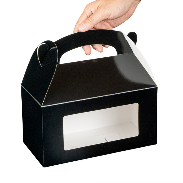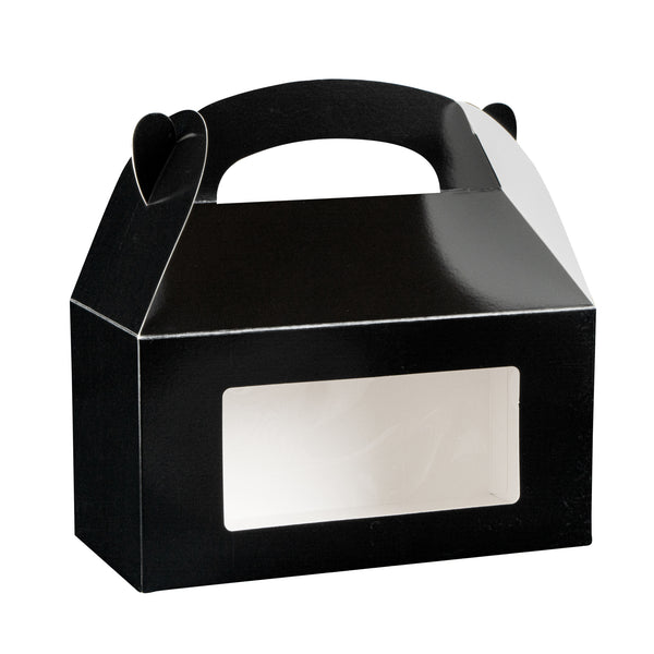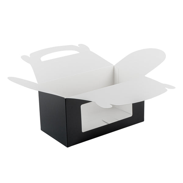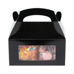 Transport your treats with style using greaseproof gable gift boxes. Bio Tek Black Paper Gable Boxes / Take Out Containers boast a 9.5 inches length and a greaseproof lining to prevent oils from seeping through, making them ideal for maintaining the integrity of your culinary creations. The integrated plastic window of these black kraft favor boxes offers an enticing sneak peek of the contents, providing a visual treat that attracts customers and enhances the presentation of baked goods or gourmet gifts. For convenience, a built-in handle ensures easy order transport, allowing foodservice professionals to carry multiple orders comfortably and efficiently. Crafted from recyclable paper, these viewing window gift boxes are an eco-conscious choice for foodservice businesses aiming to minimize their environmental footprint. With dimensions of 9.5 inches by 5 inches by 5 inches, they are freezer-safe and suitable for a variety of applications. Sold in a 100 count box.