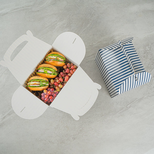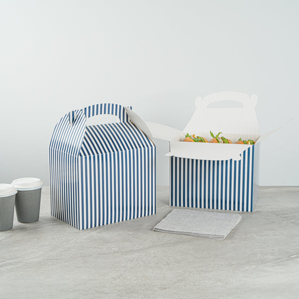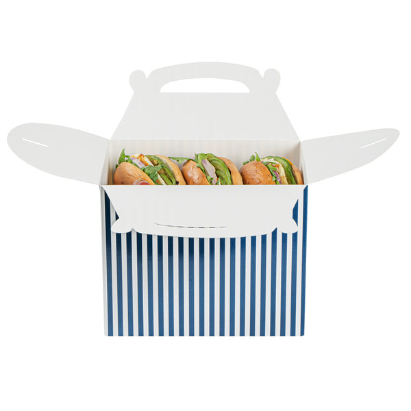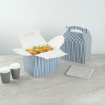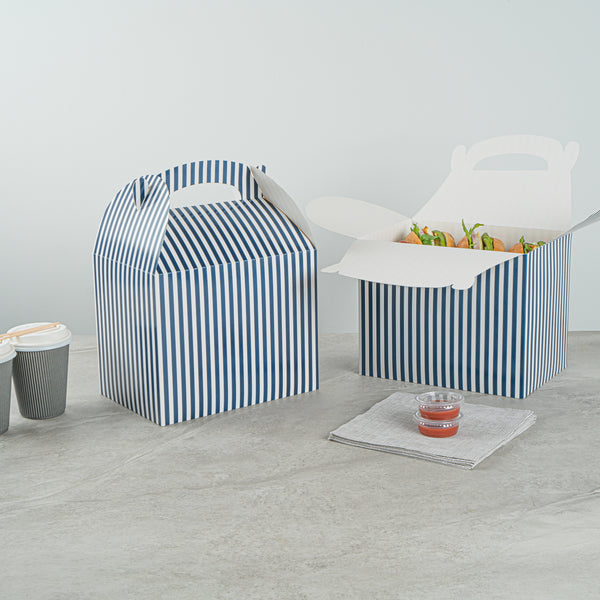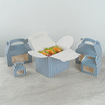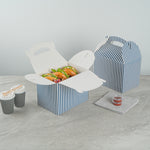 BLUE AND WHITE STRIPE PAPER GABLE BOX/TAKE OUT CONTAINER - COMPOSTABLE