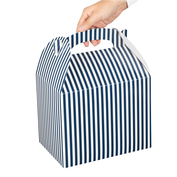 Enhance your packaging with charming and functional design. Bio Tek Blue and White Stripe Paper Gable Gift Boxes feature a built-in handle that enables you to carry orders comfortably, ensuring ease for on-the-go catering services. The freezer-safe design allows you to store frozen treats with confidence, making these gable gift boxes ideal for a variety of foodservice applications. Additionally, the eye-catching blue and white stripes add a delightful touch to your packaging, helping to attract customers' attention effortlessly. Crafted from paper, these paper gift boxes are commercially compostable, reinforcing your commitment to sustainability. Measuring 10 inches in length, 7 inches in width, and 8 inches in height, these favor boxes provide ample space for your culinary creations. Elevate your presentation and demonstrate your attention to detail with these versatile gift boxes. Each order includes 25 Bio Tek Paper Gable Gift Boxes.