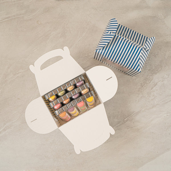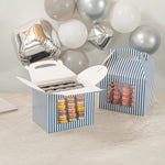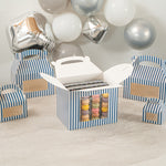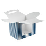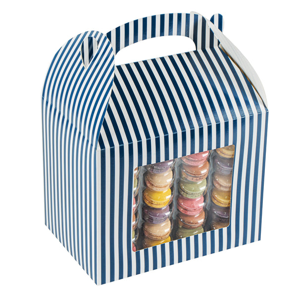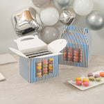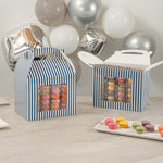 Add a stylish touch to your food packaging with these blue and white striped gable boxes designed for seamless presentation. The Bio Tek Blue and White Stripe Paper Gable Boxes / Take Out Containers include a clear window that showcases baked goods, sandwiches, or confections to customers at a glance. A sturdy built-in handle provides convenience, making it simple for guests to carry their items comfortably. These versatile take out boxes are freezer-safe, offering dependable storage for pastries and desserts without affecting freshness. Measuring 10 inches by 7 inches by 8 inches, they’re the perfect choice for bakeries, catering services, and cafes. Made from recyclable paper, these favor boxes support sustainable practices while maintaining an eye-catching design. Select these striped gable boxes to package foods with both functionality and charm. Sold in a 25 count box.
