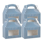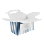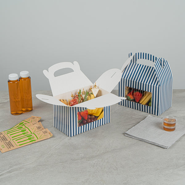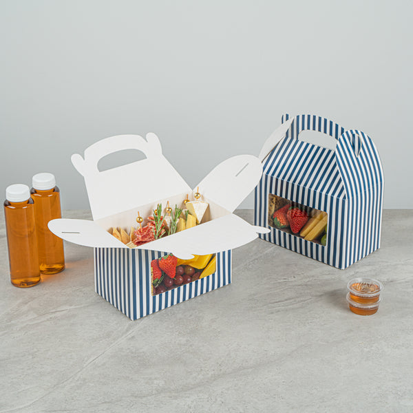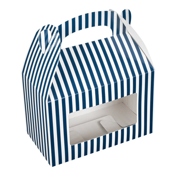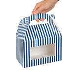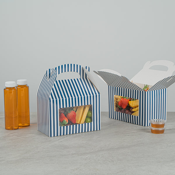 Showcase your culinary creations with versatile packaging that enhances customer experience. Bio Tek Blue and White Stripe Paper Gable Boxes / Take Out Containers are designed with an integrated plastic window that offers an enticing preview of your delicious contents, perfect for enhancing the appeal of your gable gift boxes. Measuring 8.5 inches in length, 4.75 inches in width, and 5.5 inches in height, these paper gift boxes are crafted from sturdy paper and are freezer-safe, ensuring that treats remain fresh and suitable for bulk storage. The built-in handle allows for comfortable transport, making it easy for your customers to carry their orders home. Their recyclable material aligns with eco-conscious practices, offering a sustainable option for cardboard treat boxes. Elevate your packaging solutions with these multifunctional boxes that promise to keep your confections secure and appealing. Sold in a 100 count box.