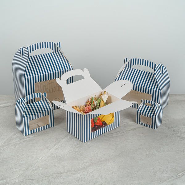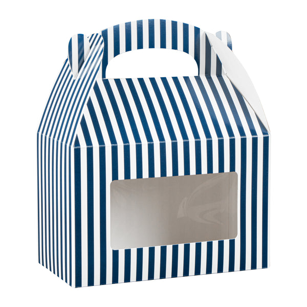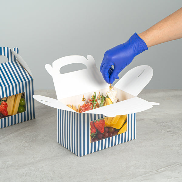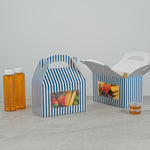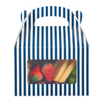 Showcase your culinary creations with versatile packaging that enhances customer experience. Bio Tek Blue and White Stripe Paper Gable Boxes / Take Out Containers are designed with an integrated plastic window that offers an enticing preview of your delicious contents, perfect for enhancing the appeal of your gable gift boxes. Measuring 8.5 inches in length, 4.75 inches in width, and 5.5 inches in height, these paper gift boxes are crafted from sturdy paper and are freezer-safe, ensuring that treats remain fresh and suitable for bulk storage. The built-in handle allows for comfortable transport, making it easy for your customers to carry their orders home. Their recyclable material aligns with eco-conscious practices, offering a sustainable option for cardboard treat boxes. Elevate your packaging solutions with these multifunctional boxes that promise to keep your confections secure and appealing. Sold in a 25 count box.