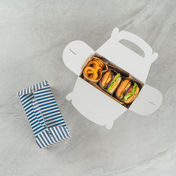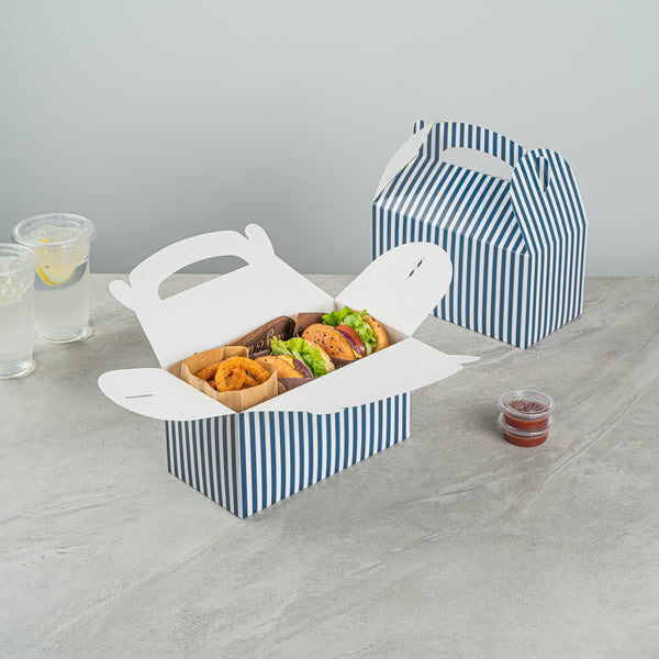 BLUE & WHITE STRIPE PAPER GABLE BOX / TAKE OUT CONTAINER - COMPOSTABLE