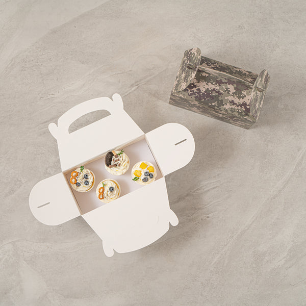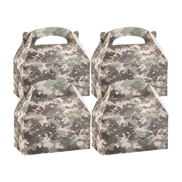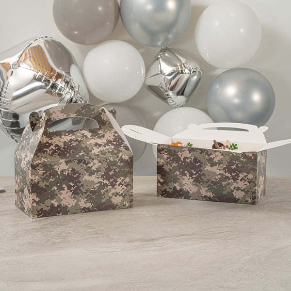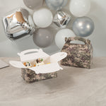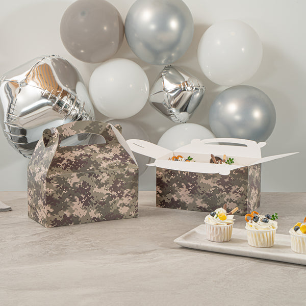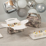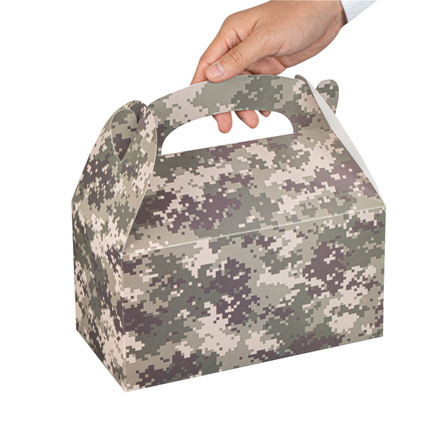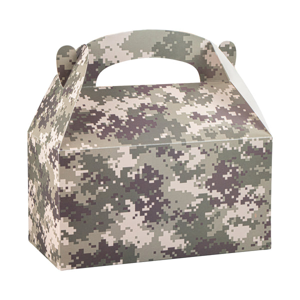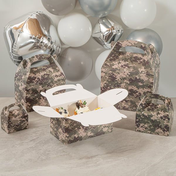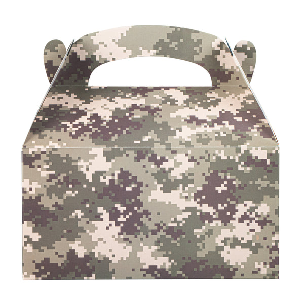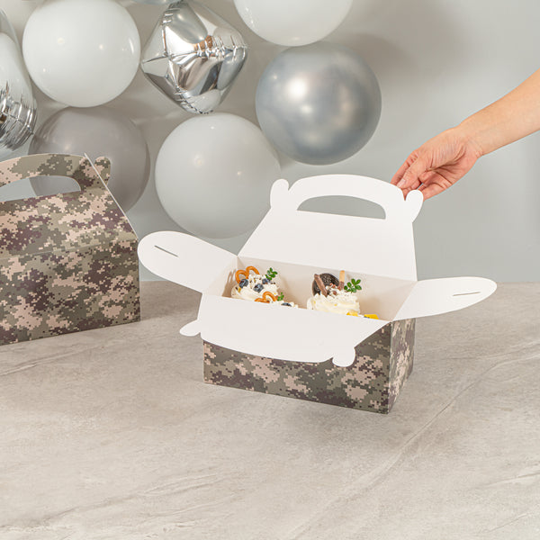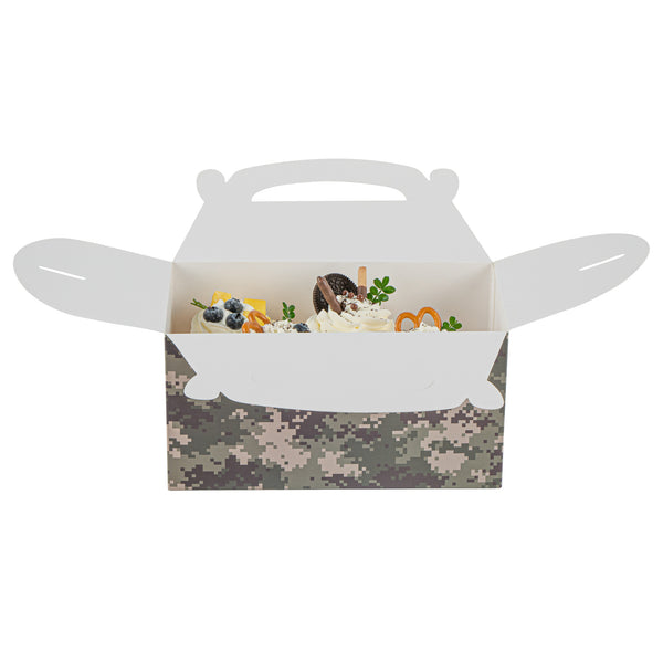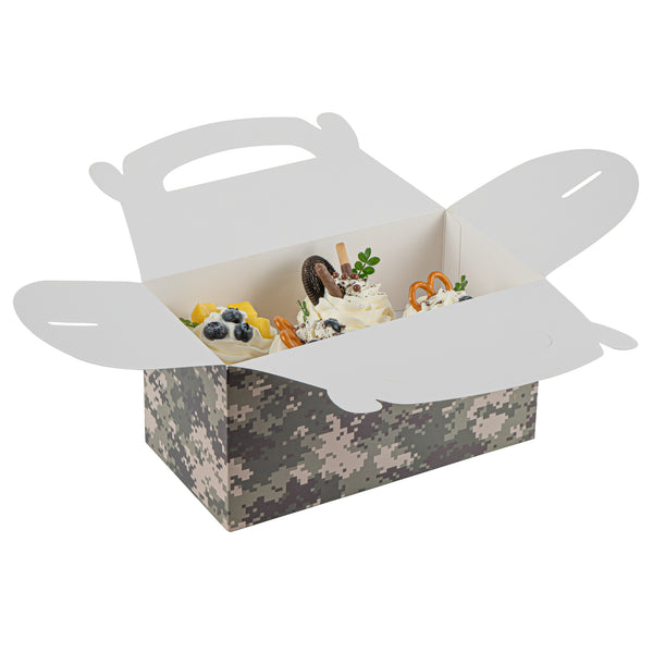 Bring rugged style to your packaging with Bio Tek Camouflage Paper Gable Boxes / Take Out Containers, a reliable option for foodservice and events. Designed with an easy-to-carry handle, these boxes make transporting baked goods, snacks, or take out meals simple and secure. Their durable paper construction offers dependable support for a variety of foods while maintaining a lightweight, portable design. Commercially Commercially composatble, they provide an eco-conscious solution for businesses seeking sustainable packaging without sacrificing performance. Measuring 9.5 inches in length, 5 inches in width, and 5 inches in height, these versatile containers are ideal for smaller portions, party favors, or compact grab-and-go items. Perfect for adding both function and style to your service, these camouflage gable boxes are sold in a 100 count box.