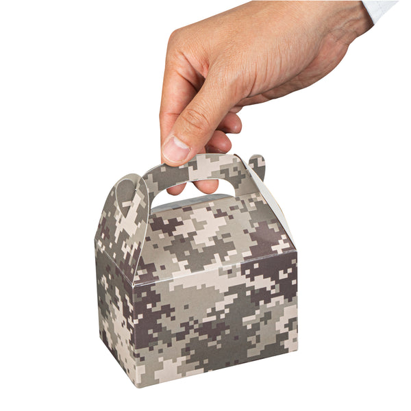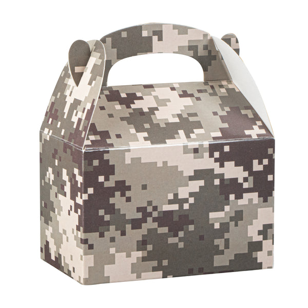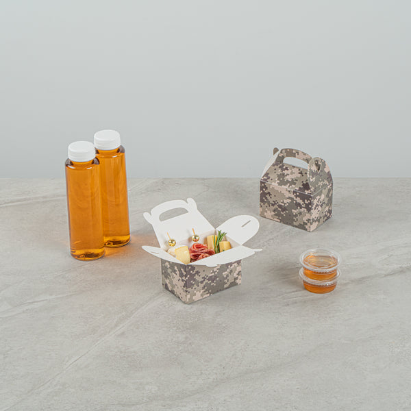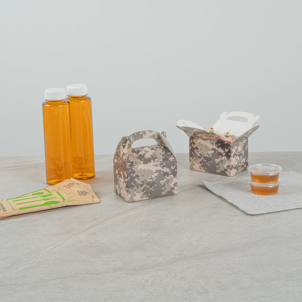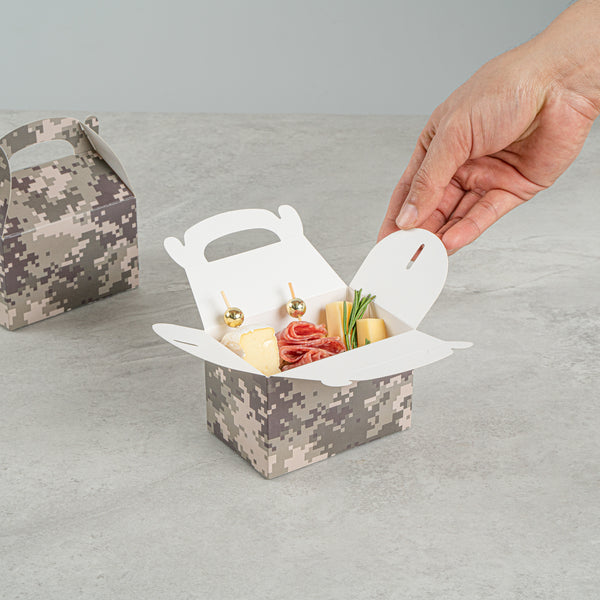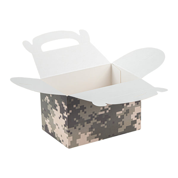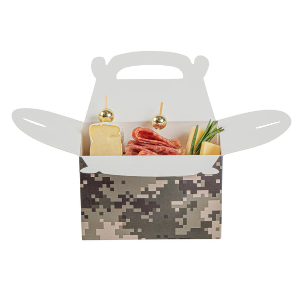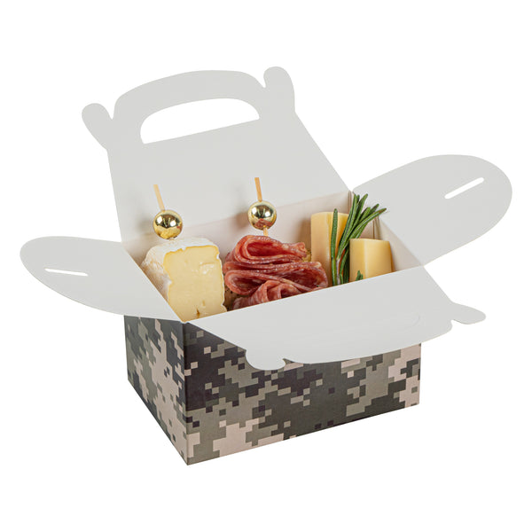 Enhance your event presentation with versatile, stylish packaging. Bio Tek Gable Gift Boxes feature a charming camouflage pattern that adds a unique touch to food packaging, making them ideal for any festive occasion. Designed with a built-in handle, these wedding favor boxes allow for comfortable carrying, simplifying transport during busy events. Their freezer-safe design ensures that you can store treats for later use without compromising freshness, making them practical small gift boxes for caterers and event planners alike. Crafted from eco-friendly paper, these boxes are commercially Commercially composatble, biodegradable, and recyclable, aligning with sustainable practices. Measuring 4 inches in length, 2.5 inches in width, and 2.5 inches in height, they are perfect for holding delightful goodies. Secure your catering needs today with these reliable packaging solutions. Each order includes 100 Bio Tek Gable Gift Boxes.