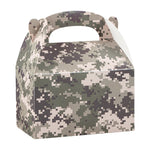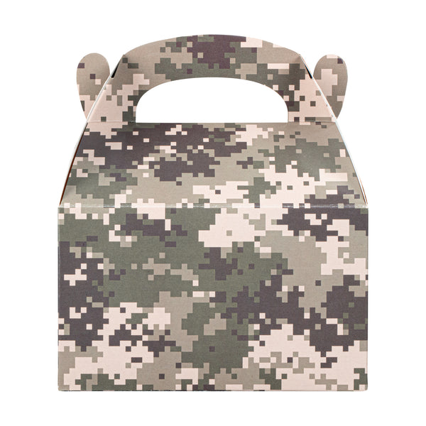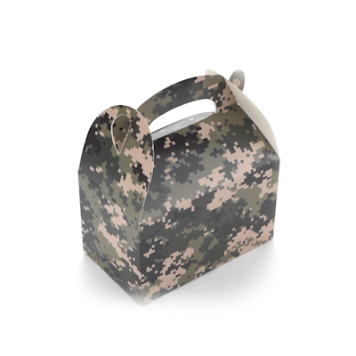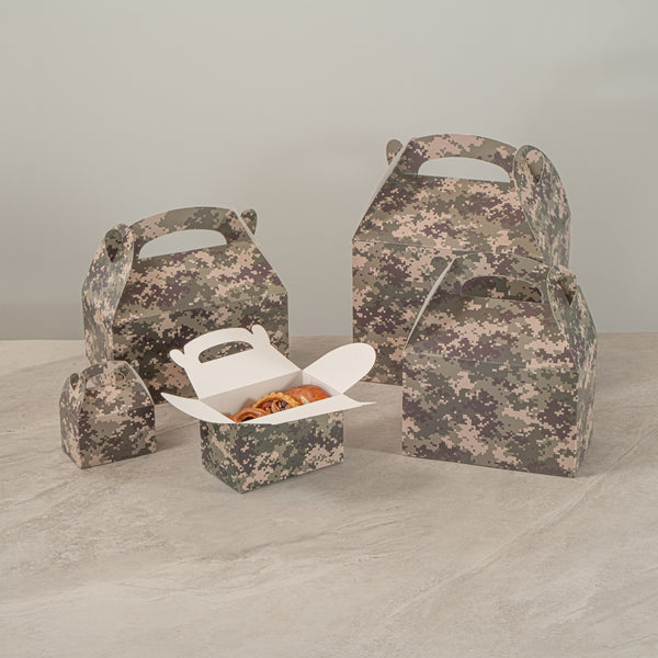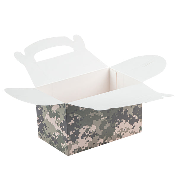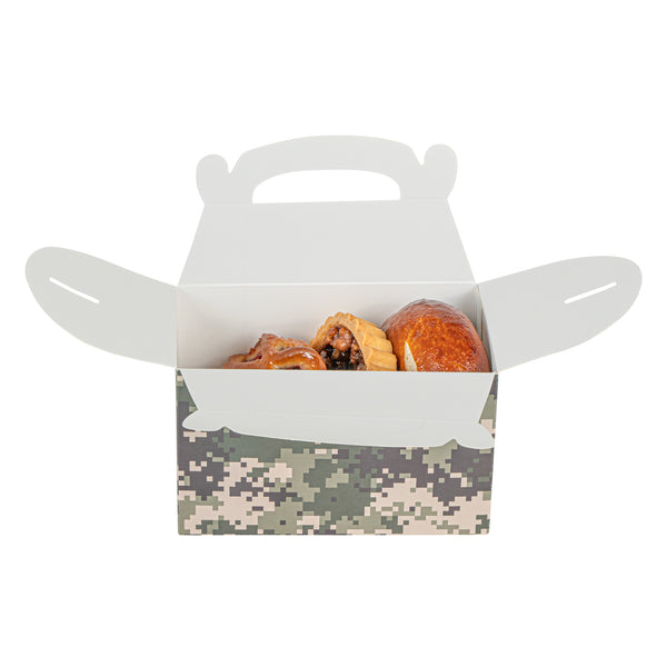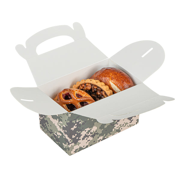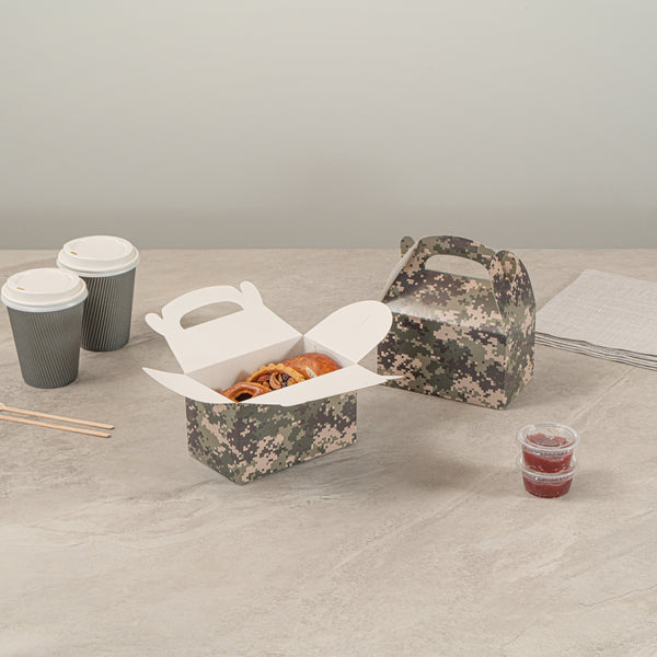 Enhance your presentation with charming camouflage packaging. Bio Tek Freezer-Safe Gable Gift Boxes feature a delightful camouflage pattern, adding charm to your food packaging while ensuring your offerings stand out. These gable gift boxes include a built-in handle, enabling you to carry orders comfortably, making them ideal for catering services and retail operations. With a freezer-safe design, they allow you to store desserts and treats conveniently for later use, ensuring freshness and quality, a perfect choice for wedding favor boxes. Measuring 6 inches in length, 3.5 inches in width, and 3.5 inches in height, these boxes are crafted from sturdy paper, providing a reliable, recyclable, and biodegradable packaging solution. Elevate your events with these versatile cardboard favor boxes, suitable for both hot and cold foods. Each order includes 25 Bio Tek Freezer-Safe Gable Gift Boxes.