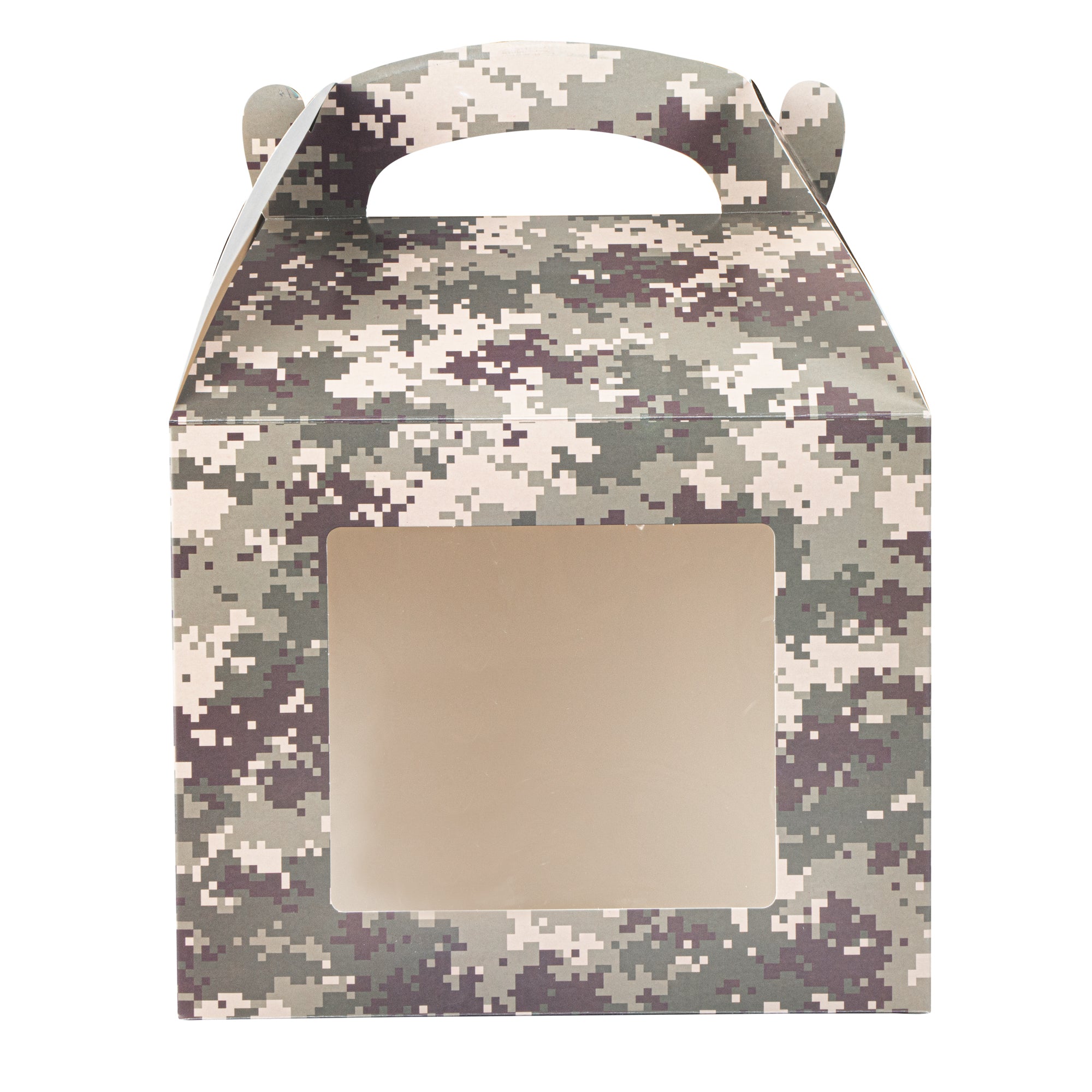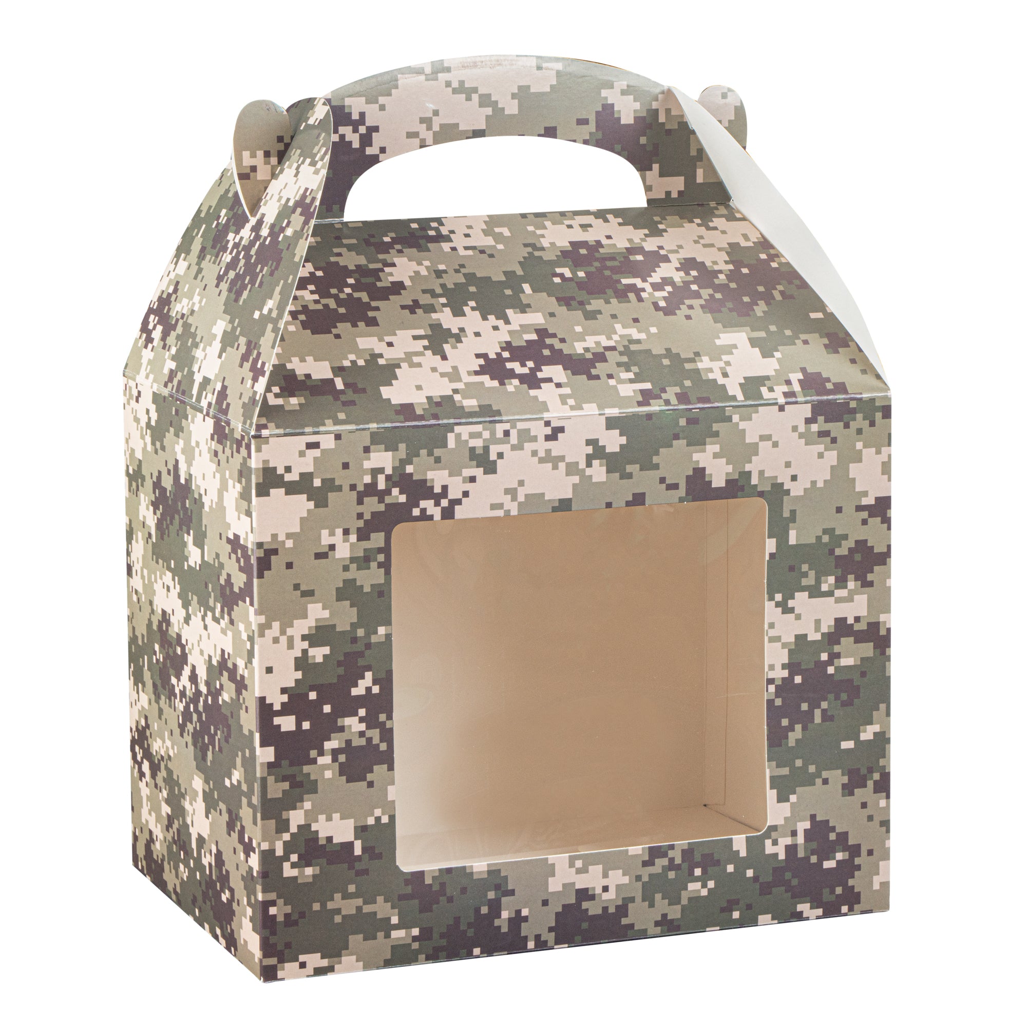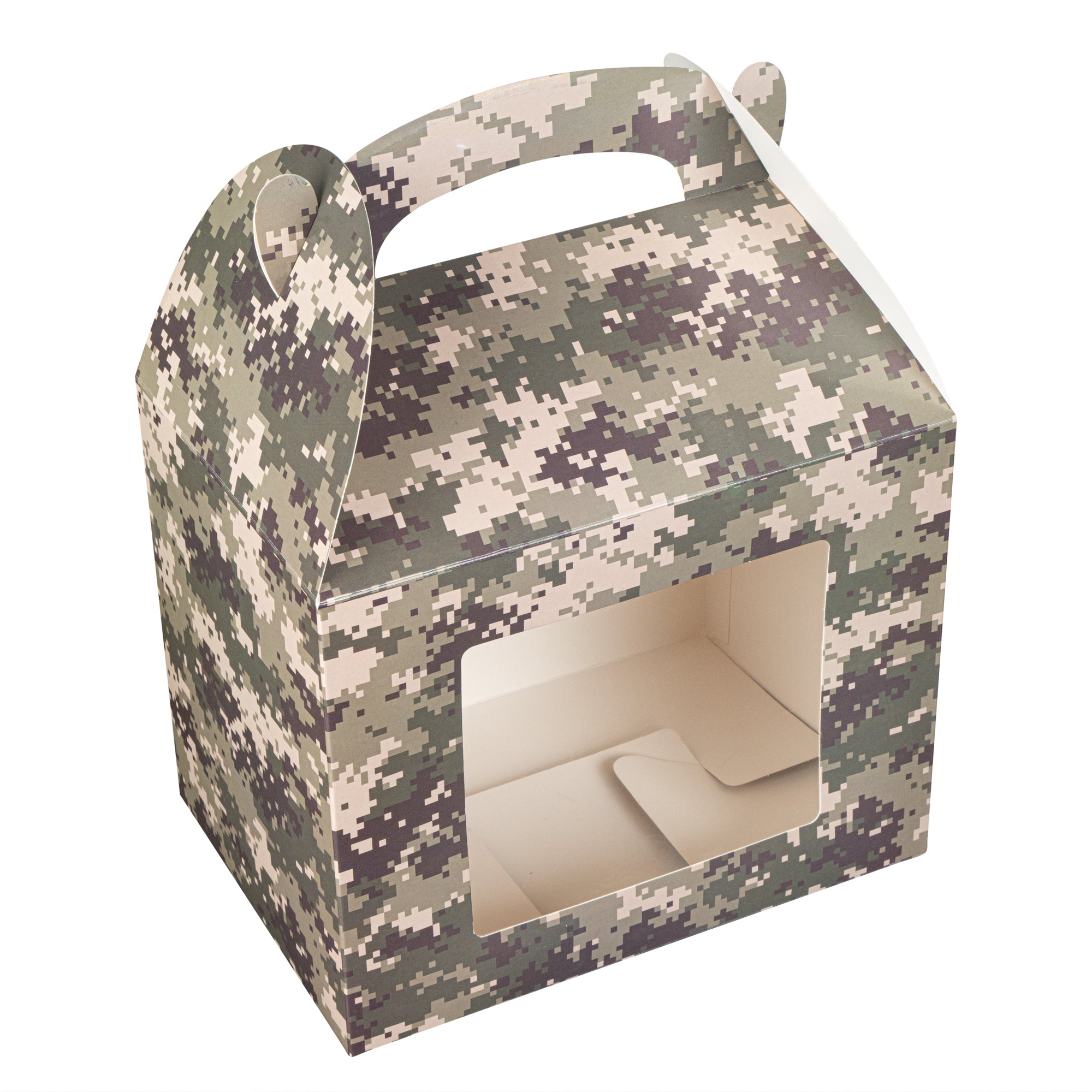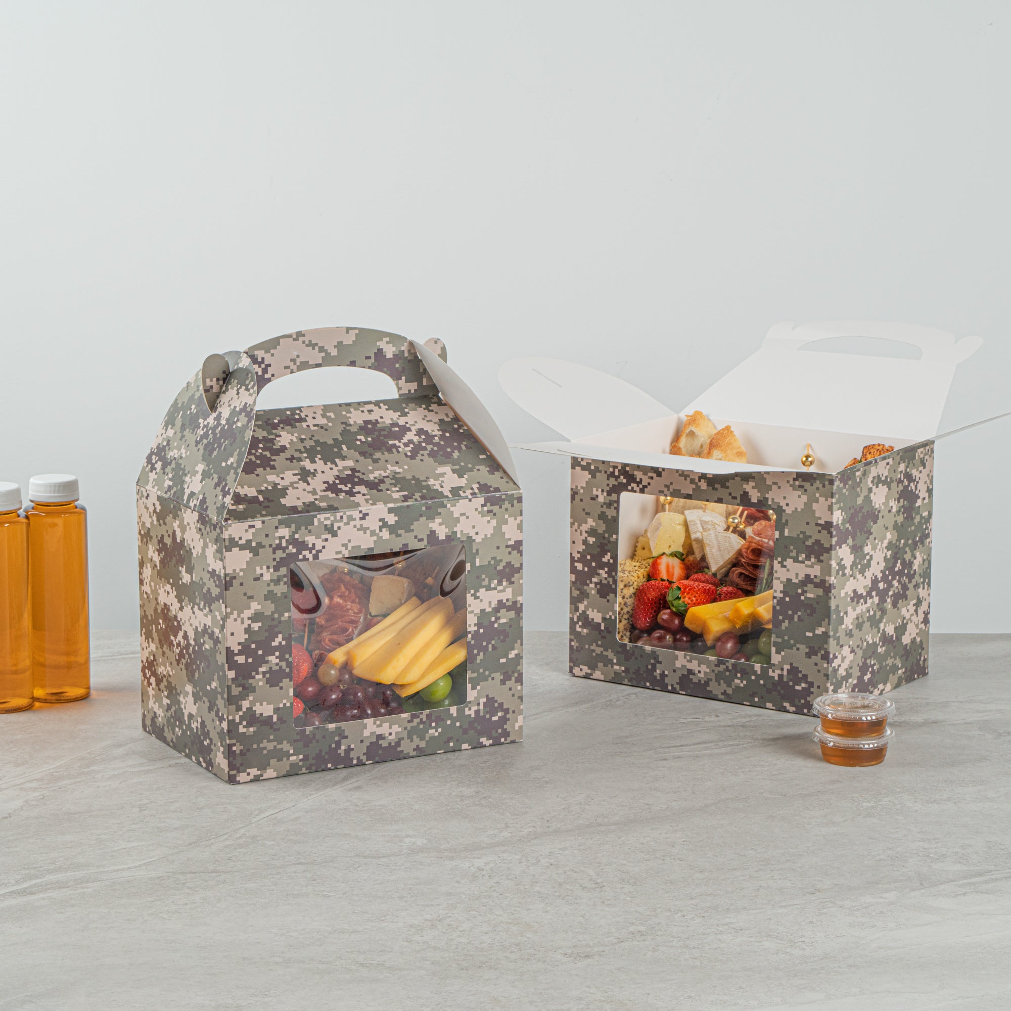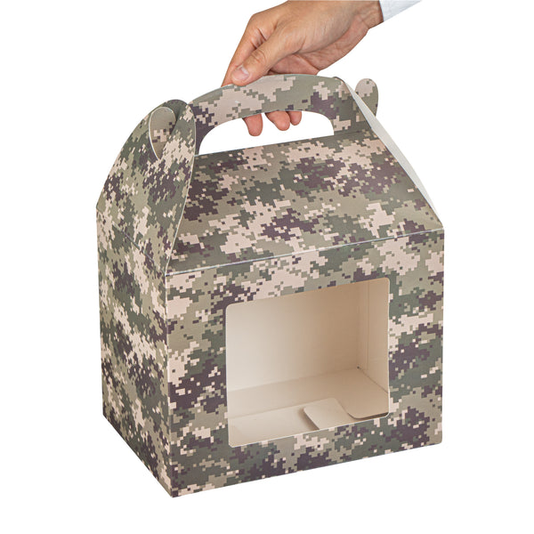 Deliver treats with a bold look using these camouflage paper gable boxes. The Bio Tek Camouflage Paper Gable Boxes / Take Out Containers come with a built-in plastic window that puts your pastries, cookies, or party favors on display, drawing attention to every detail. Their ergonomic handle allows for comfortable and reliable transport of customer orders. Designed to be freezer-safe, these durable containers provide storage versatility for bakeries and catering operations. At 10 inches in length, 7 inches in width, and 8 inches in height, they offer generous space for a variety of foods and gifts. Made from recyclable paper, these boxes combine practicality with a sustainable edge. Add these camouflage gift boxes to your packaging collection to impress and serve with ease. Sold in a 25 count box.