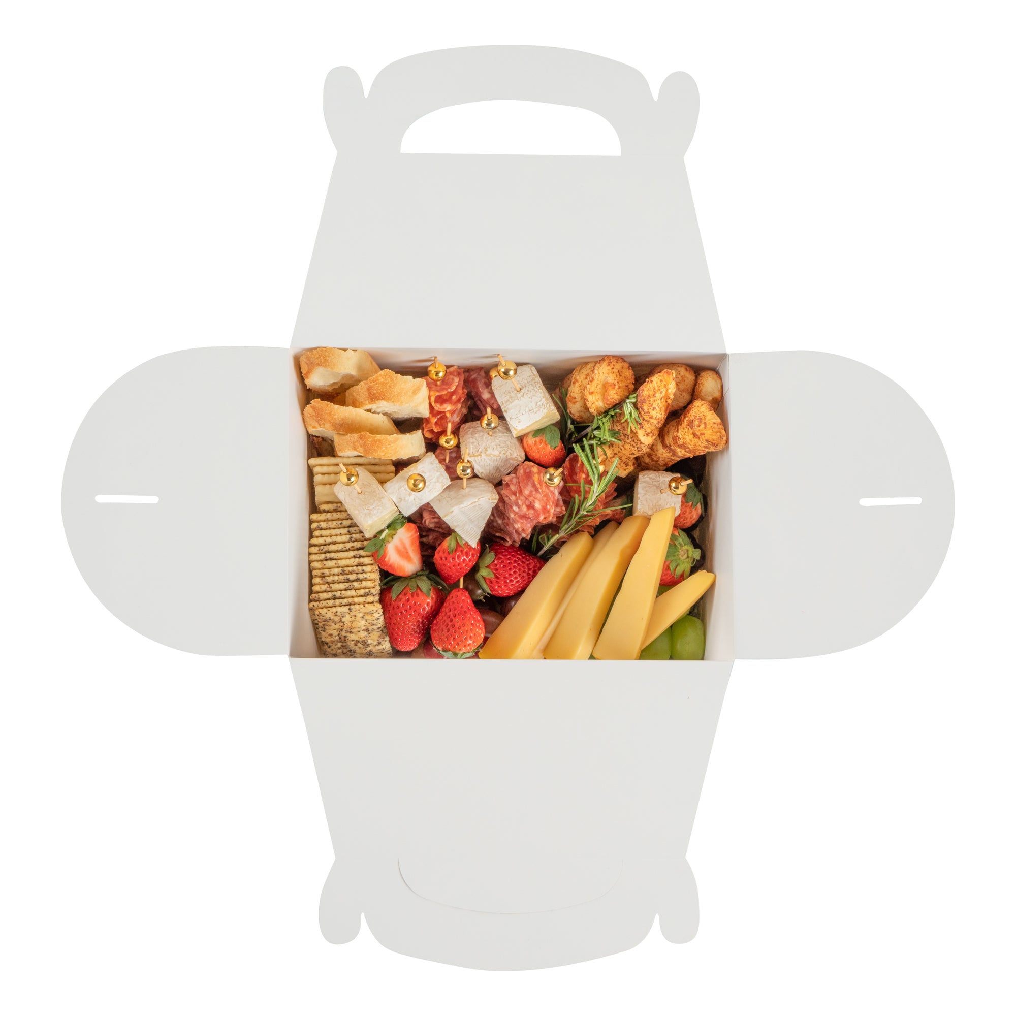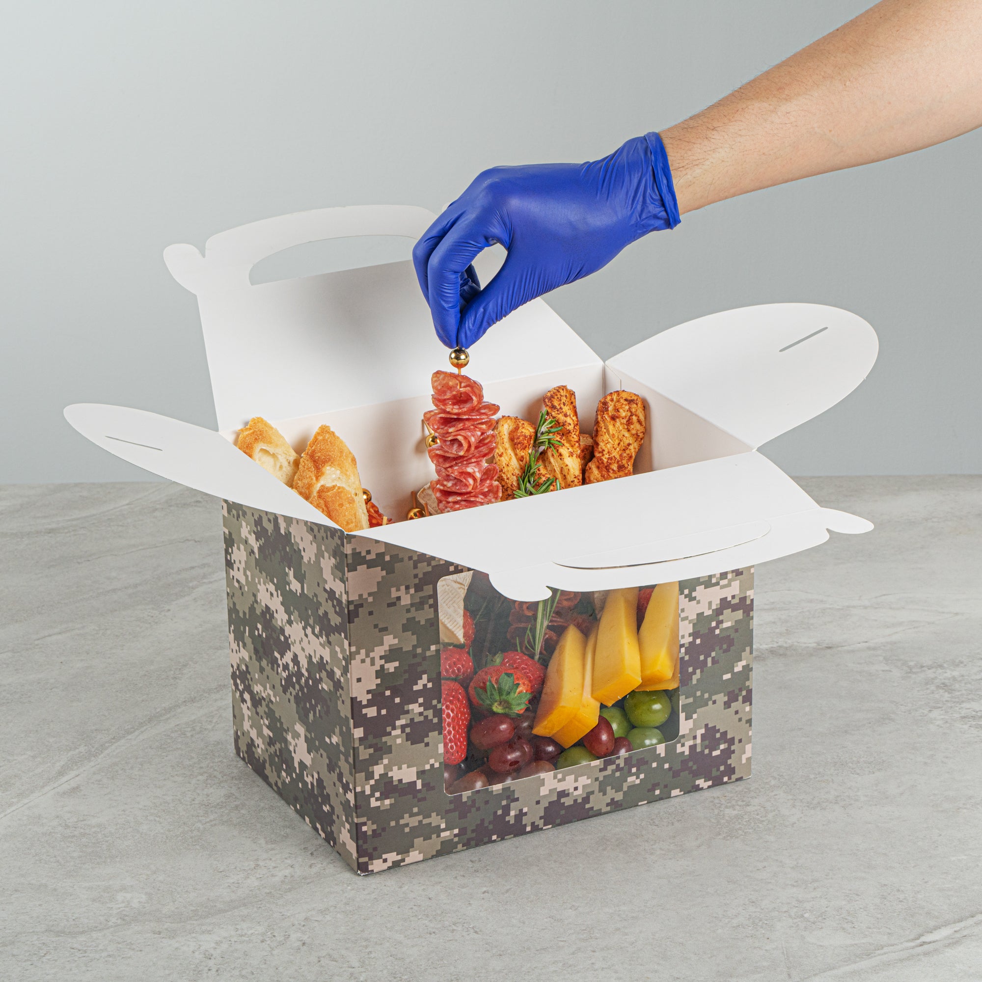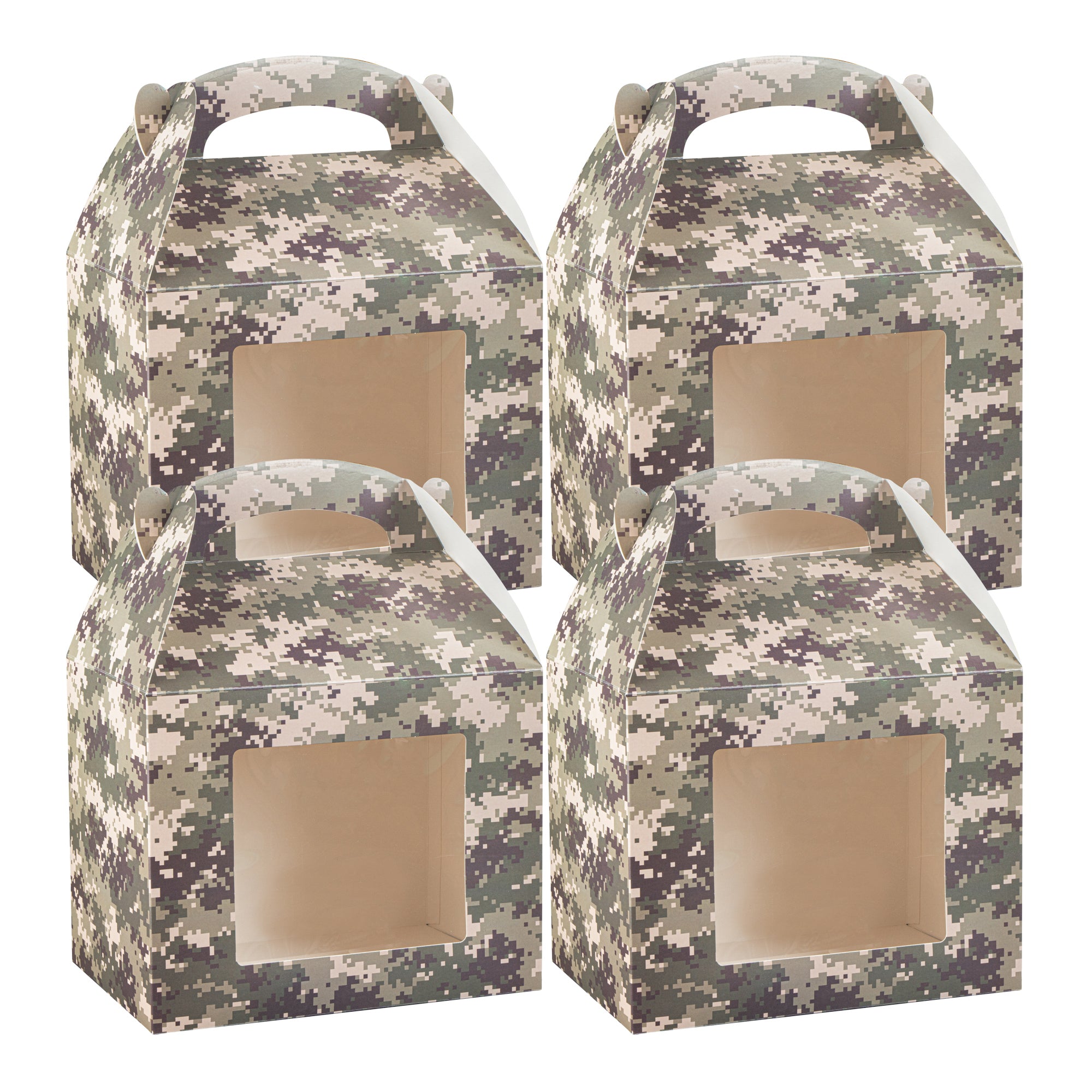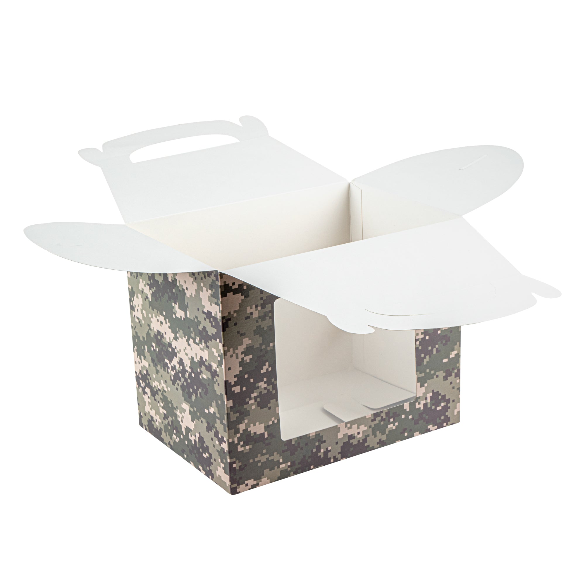 Deliver treats with a bold look using these camouflage paper gable boxes. The Bio Tek Camouflage Paper Gable Boxes / Take Out Containers come with a built-in plastic window that puts your pastries, cookies, or party favors on display, drawing attention to every detail. Their ergonomic handle allows for comfortable and reliable transport of customer orders. Designed to be freezer-safe, these durable containers provide storage versatility for bakeries and catering operations. At 10 inches in length, 7 inches in width, and 8 inches in height, they offer generous space for a variety of foods and gifts. Made from recyclable paper, these boxes combine practicality with a sustainable edge. Add these camouflage gift boxes to your packaging collection to impress and serve with ease. Sold in a 25 count box.