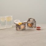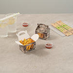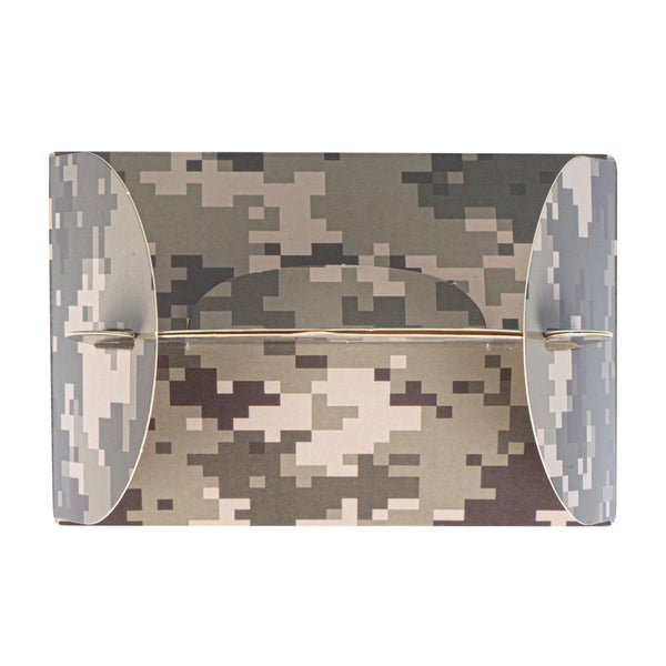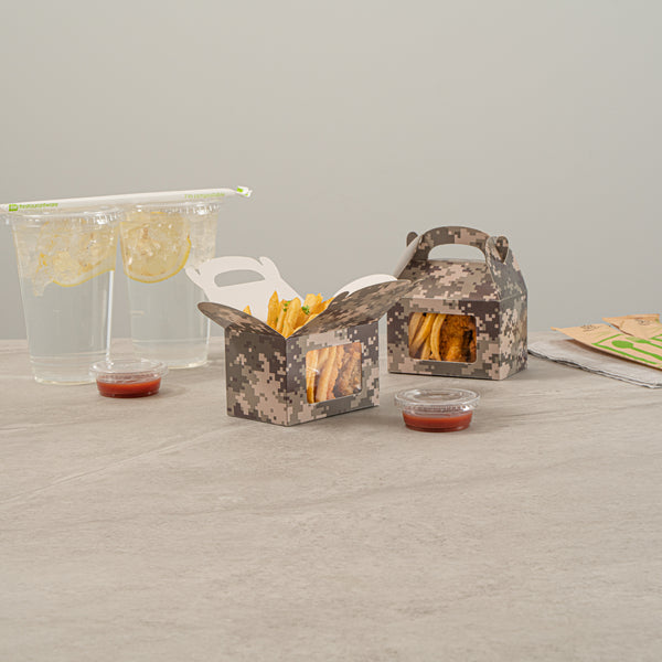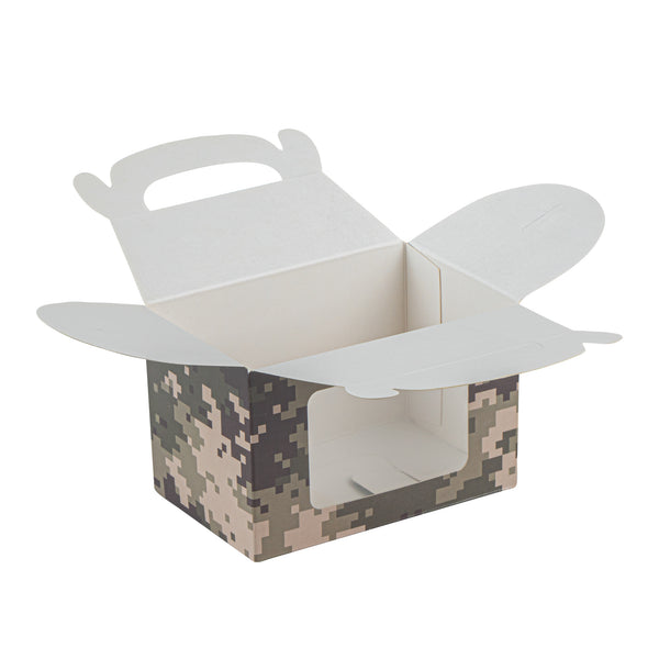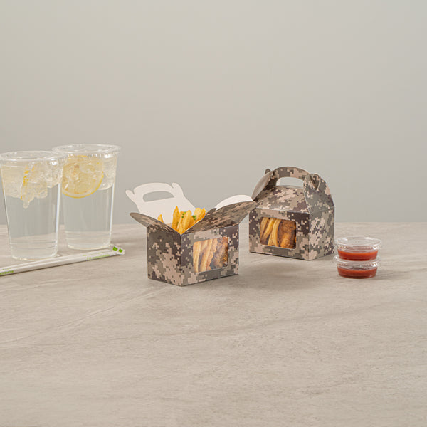 Stand out with Bio Tek Camouflage Paper Gable Boxes / Take Out Containers, an eye-catching choice for packaging. The camouflage print creates a bold, adventurous look that’s ideal for themed events or standout displays. Crafted from sturdy paper, these containers are recyclable, giving businesses an eco-friendly way to package food. Each box features a clear window that puts your items on display, enticing customers and enhancing presentation. Constructed with freezer-safe durability, they help maintain the quality of baked goods, confections, or small snacks. A built-in handle allows for easy carrying, making them practical for both businesses and event settings. Sized at 4 inches long, 2.5 inches wide, and 2.5 inches tall, these compact containers are perfect for giveaways, party favors, or individual portions. Convenient and stylish, they come in a 100 count box.