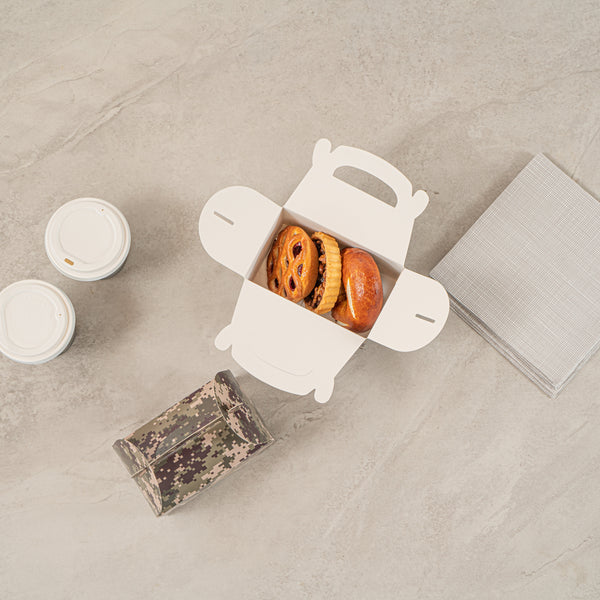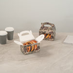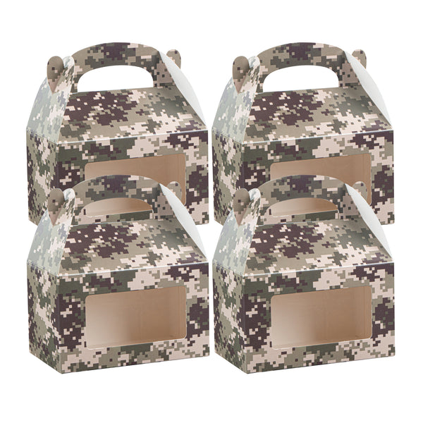 Showcase your treats with ease using camo gift boxes. Bio Tek Camouflage Paper Gable Boxes / Take Out Containers feature an integrated plastic window, allowing customers to get an enticing sneak peek of your creations, all while maintaining the freshness and appeal of your products. With a built-in handle, these kraft paper gift boxes ensure that transporting orders is comfortable and hassle-free for your staff, perfect for enhancing your takeaway service. Measuring 6 inches in length by 3.5 inches in width and height, these window display boxes are constructed from durable paper that is both recyclable and ideal for hot or cold food storage. Their freezer-safe design means you can store your treats for longer periods without compromising quality, making them an essential addition to your foodservice operations. Enhance your packaging solutions today with these versatile and functional boxes. Sold in a 25 count box.