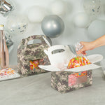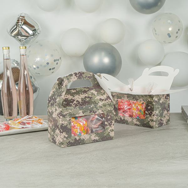 Showcase your treats beautifully with versatile, eco-friendly packaging. Bio Tek Camouflage Paper Gable Boxes / Take Out Containers feature an integrated plastic window that offers an enticing content preview, making these paper gift boxes ideal for bakeries and cafes. With a built-in handle, these cardboard favor boxes ensure easy carrying of orders, providing a convenient solution for customers on the go. The freezer-safe design supports treat storage and longevity, allowing you to maintain the freshness of your delicacies. Constructed from sturdy paper, these windowed gift boxes are recyclable, aligning with sustainable practices while offering visual appeal in their vibrant green color. Measuring 8.5 inches in length, 4.75 inches in width, and 5.5 inches in height, these boxes are perfect for a variety of confectionery items. Elevate your packaging with these reliable and functional boxes. Sold in a 100 count box.