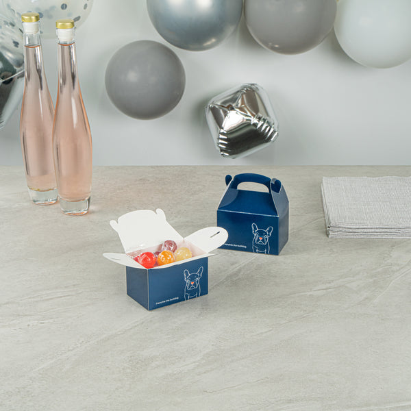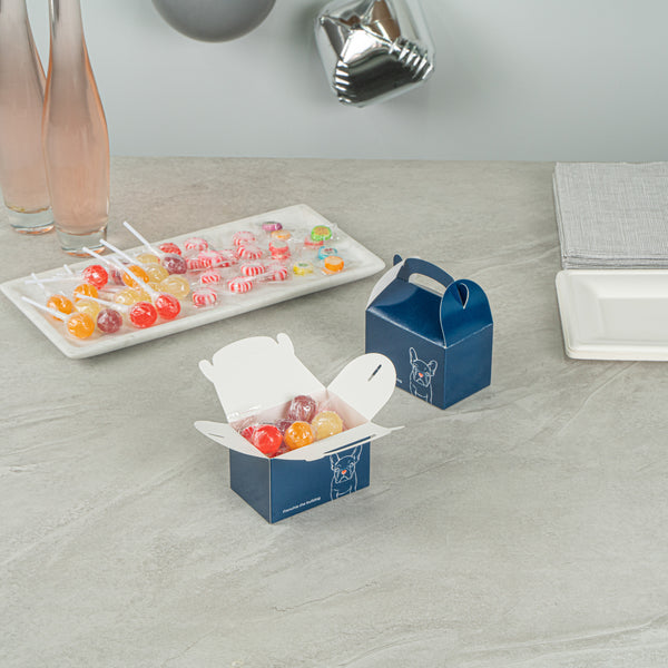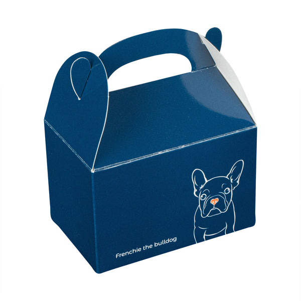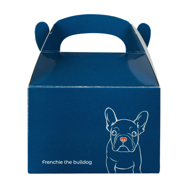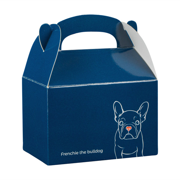 Enhance your to-go packaging with a charming flair. Bio Tek Frenchie Design Kraft Gable Boxes feature a delightful Frenchie bulldog design that adds a touch of whimsy to your packaging, making them perfect kraft gable boxes for bakeries and gift shops. Crafted from sturdy paper, these paper favor boxes come with a built-in handle that ensures easy and comfortable carrying of orders, ideal for bustling foodservice environments. The freezer-safe construction allows you to store treats effortlessly, maintaining their freshness for longer periods. With dimensions of 4 inches in length, 2.5 inches in width, and 2.5 inches in height, these handle gift boxes are perfect for a range of items, from confectioneries to small gifts. Elevate your packaging and delight your customers with these eco-friendly, recyclable, and biodegradable options. Each order includes 25 Bio Tek Frenchie Design Kraft Gable Boxes.