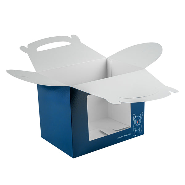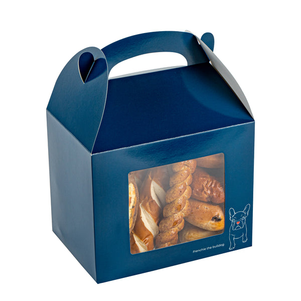 Showcase your delectable creations effortlessly with these kraft paper gift boxes. The Bio Tek Frenchie Paper Gable Boxes / Take Out Containers feature an integrated plastic window that beautifully reveals the contents inside, making it easy for customers to select their desired treats. With a built-in ergonomic handle, these blue paper boxes ensure the comfortable transport of orders, enhancing the efficiency of your service. Their freezer-safe design allows you to preserve treats for longer, accommodating the needs of foodservice professionals who require flexible storage solutions. Measuring 10 inches in length, 7 inches in width, and 8 inches in height, these gable gift boxes are ideal for bakeries and cafes seeking versatile packaging options. Made from recyclable paper, they support sustainable practices in the foodservice industry. Invest in these party favor boxes to elevate your presentation and streamline your operations. Sold in a 100 count box.