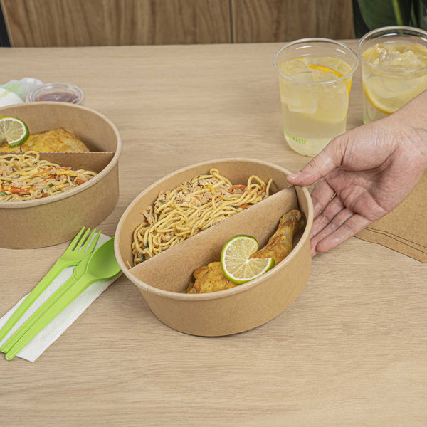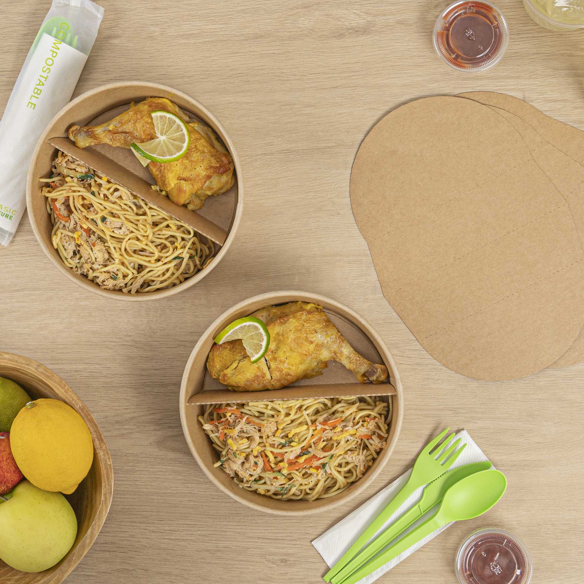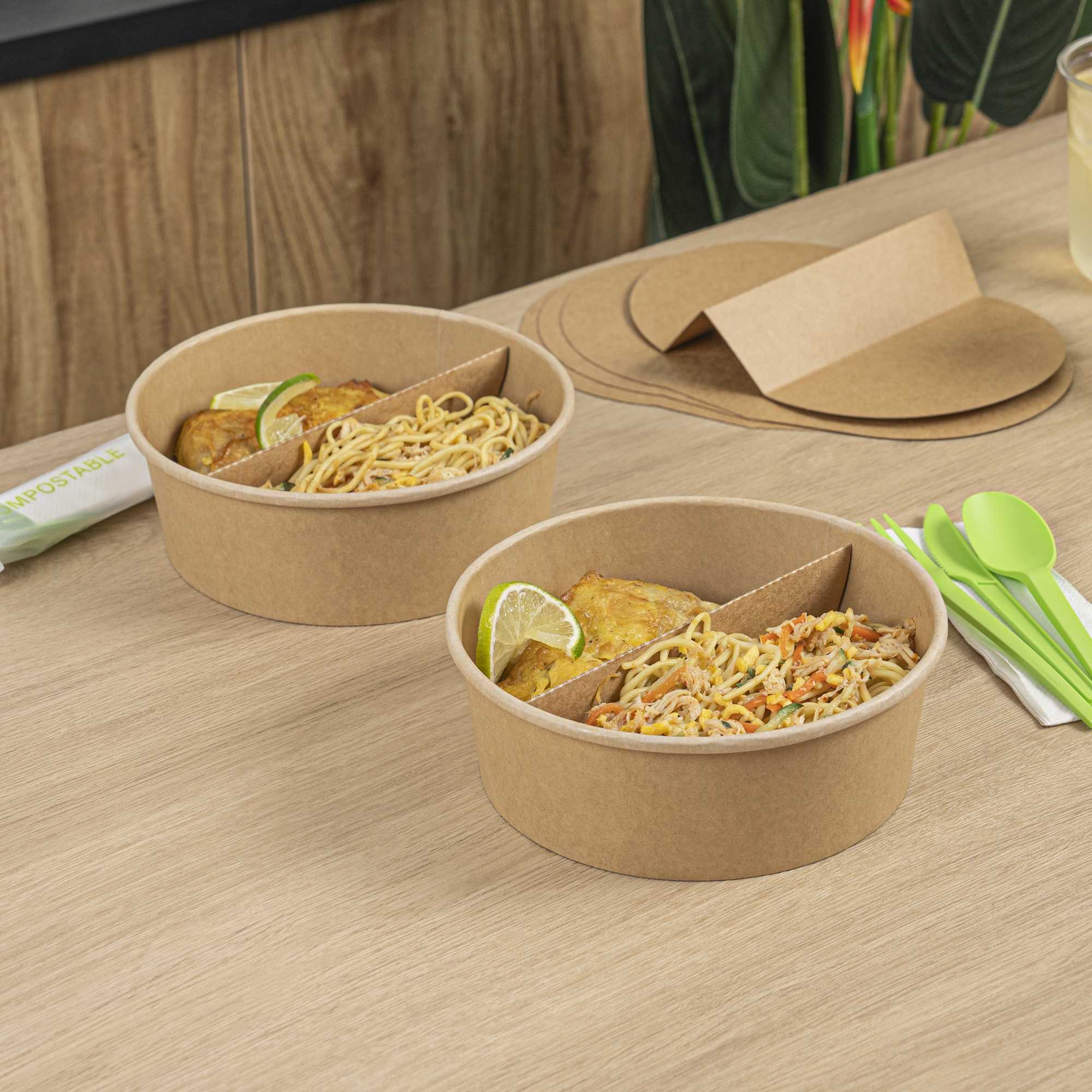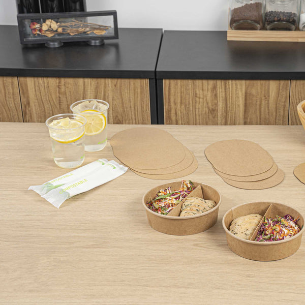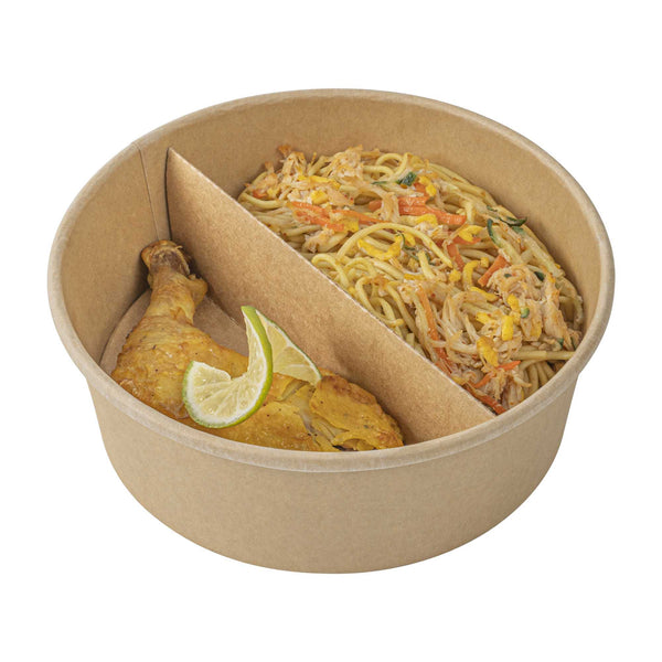 Effortlessly enhance your takeout presentation with our Bio Tek Kraft Paper 2-Compartment Inserts. Pair these divider inserts with our collection of matching Bio Tek take out containers, neatly dividing the container into two compartments. These partition food inserts have 2 compartments and allow you to keep different food items separate, reducing flavors from mixing and maintaining a pristine presentation. Each insert is easy to assemble and fits securely into the container, keeping food intact during transit. Crafted from premium paper, these kraft paper inserts are suitable for both hot and cold food items, ensuring versatility in your food service operations. These kraft paper inserts are disposable, providing a hassle-free cleanup after every meal. Measuring 9.6 inches in length by 5.9 inches in width, these kraft paper inserts provide ample space for various food portions. Sold in a 50 count box. Containers are available and sold separately.