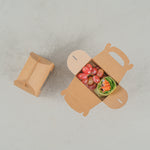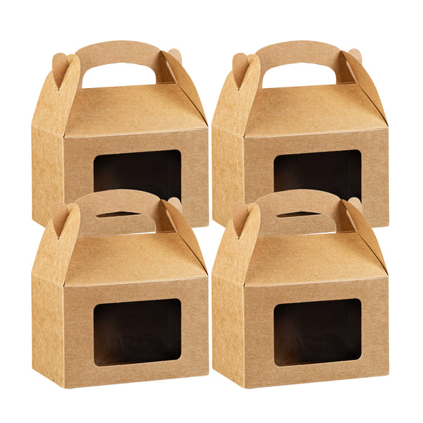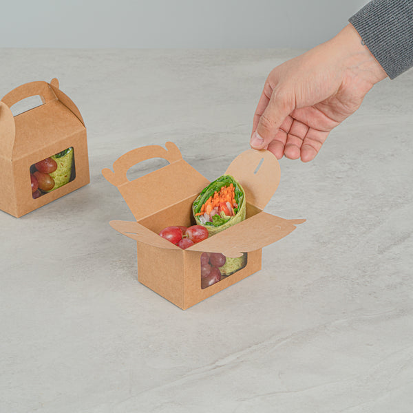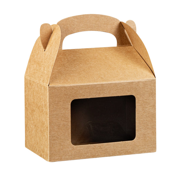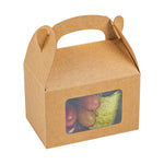 Highlight your treats with Bio Tek Kraft Paper Gable Boxes / Take Out Containers, designed with a built-in clear window that showcases the contents inside. Made from strong kraft paper, these boxes are recyclable, offering a durable yet eco-conscious packaging option. Their greaseproof lining keeps oils and sauces from seeping through, while the freezer-safe design helps preserve freshness during storage. Equipped with a sturdy handle, these containers make transport effortless for both staff and guests. Compact in size at 4 inches long, 2.5 inches wide, and 2.5 inches tall, they are ideal for candies, cookies, or small bakery items. Sold in a 25 count box, these kraft gable boxes combine reliability with presentation.
