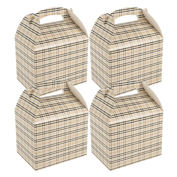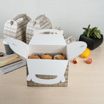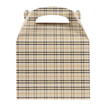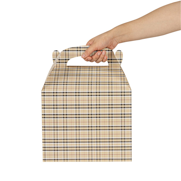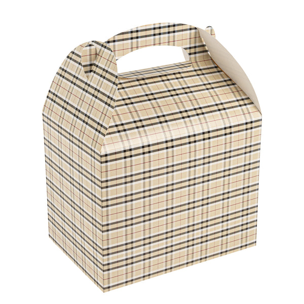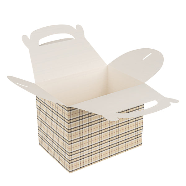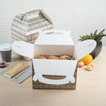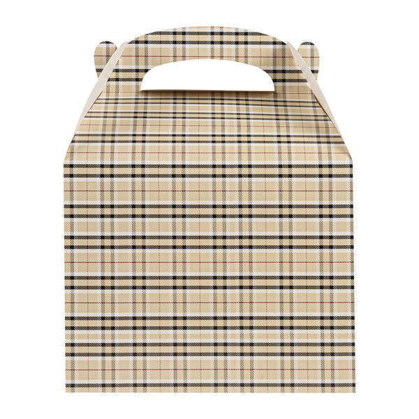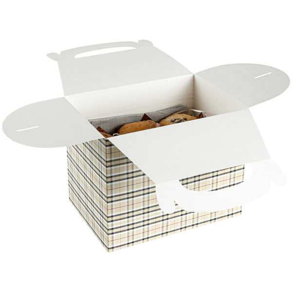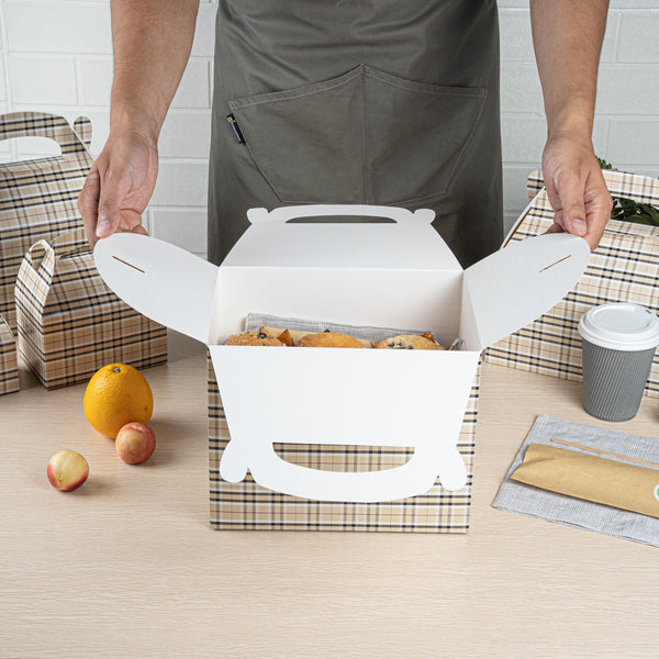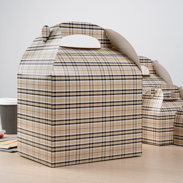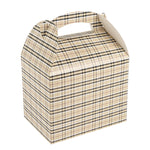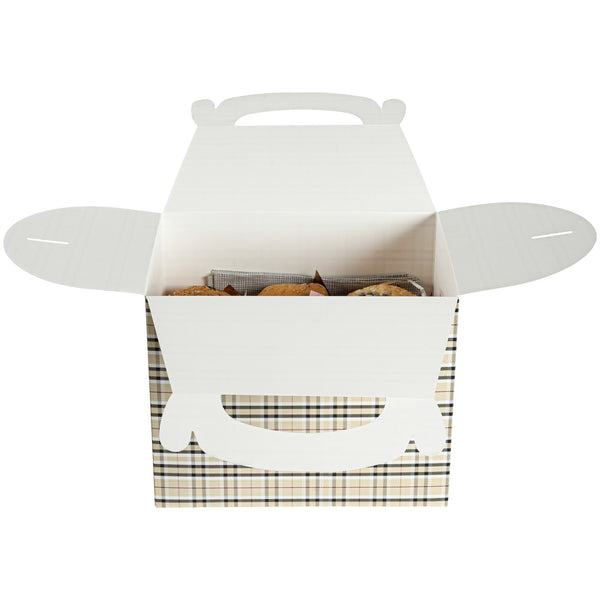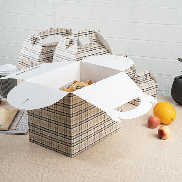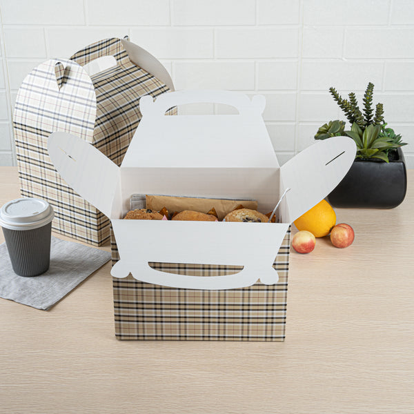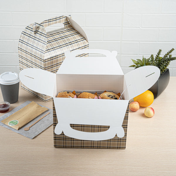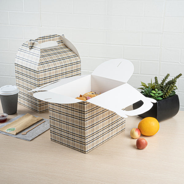 Deliver take out meals and baked goods with charm using these plaid paper gable boxes. Bio Tek Plaid Paper Gable Boxes / Take Out Containers are designed with a sturdy ergonomic handle that ensures comfortable carrying of orders. Their freezer-safe construction offers storage flexibility, helping you keep pastries and desserts fresh until ready to serve. Made from sturdy paper, these boxes are versatile enough for packaging baked goods, party favors, or catered meals. Commercially compostable and biodegradable, they provide an eco-conscious packaging option for foodservice businesses. Measuring 10 inches in length, 7 inches in width, and 8 inches in height, they provide ample room for a variety of menu items. Use these plaid boxes to combine functionality with sustainable style. Sold in a 25 count box.