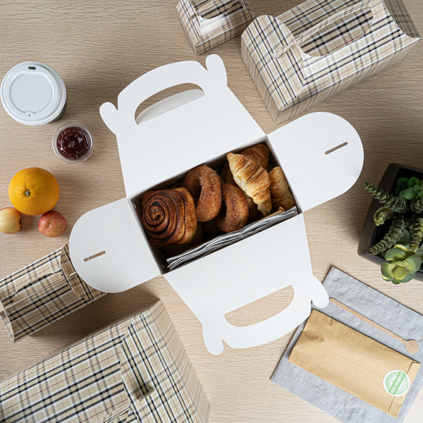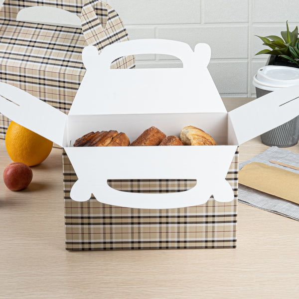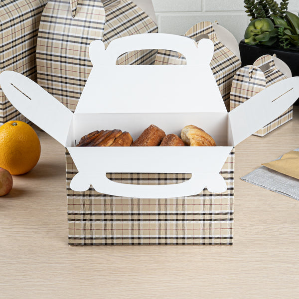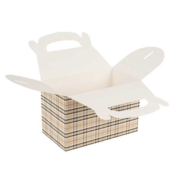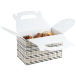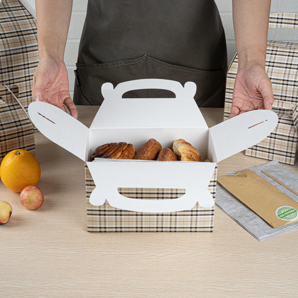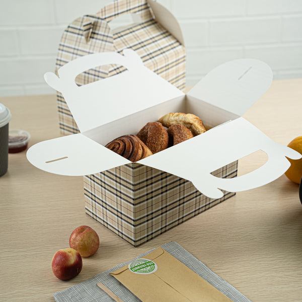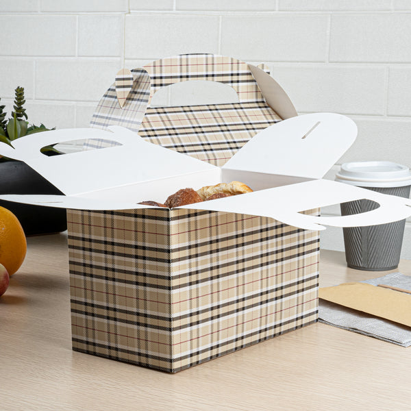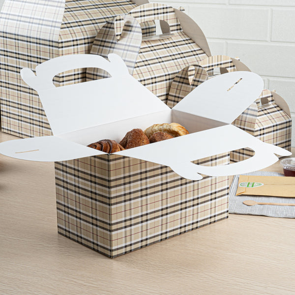 Enhance your packaging with charming and functional designs. Bio Tek Freezer-Safe Gable Gift Boxes feature a plaid pattern that adds charm to your packaging, enhancing your brand image and making these gable gift boxes a standout choice for any foodservice establishment. Crafted from sturdy paper, these boxes include a built-in handle, ensuring the comfortable carrying of orders, perfect for busy caterers and restaurateurs managing large events or weddings. Their freezer-safe design allows you to store treats, maintaining extended freshness and providing convenience for storing and transporting desserts, making them ideal as wedding favor boxes. With dimensions of 8.5 inches in length, 4.75 inches in width, and 5.5 inches in height, they are a versatile choice for various applications, including their use as cardboard gift boxes for food and non-food items alike. Upgrade your packaging solutions and showcase your attention to detail with these biodegradable and commercially Commercially composatble boxes. Each order includes 100 Bio Tek Freezer-Safe Gable Gift Boxes.