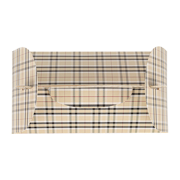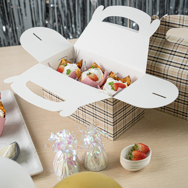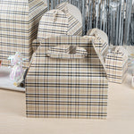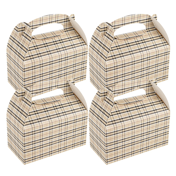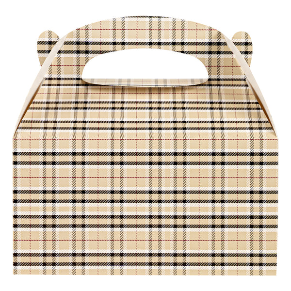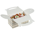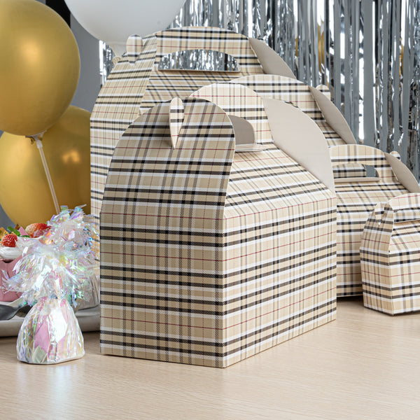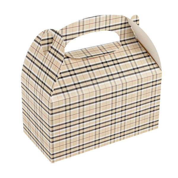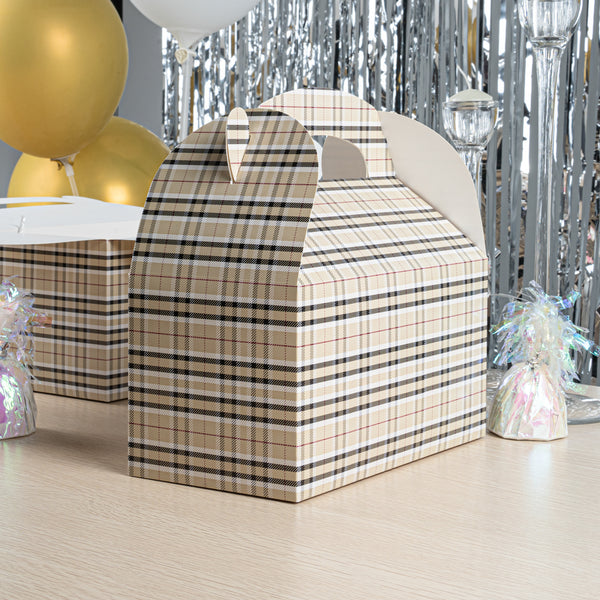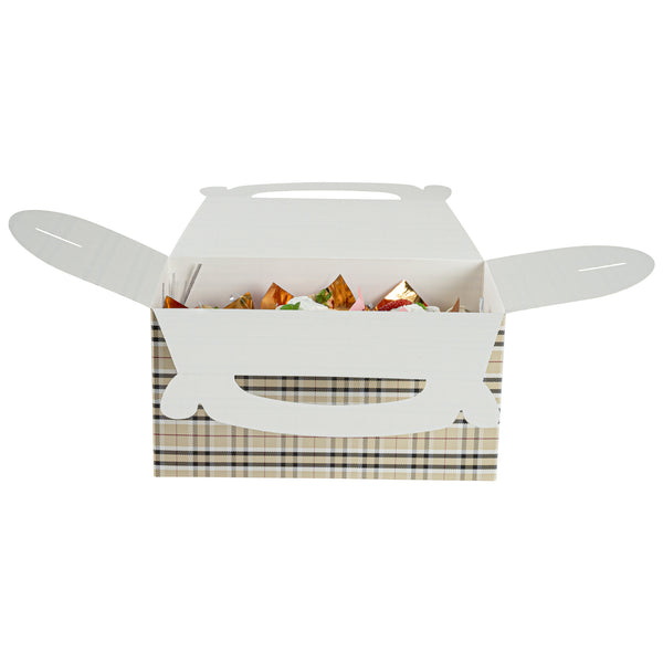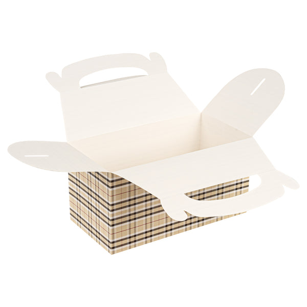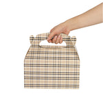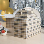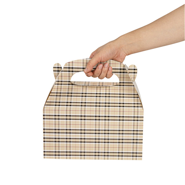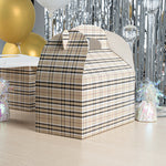 Deliver memorable presentations with the charming Bio Tek Gable Gift Boxes. These paper boxes feature a delightful plaid pattern that enhances the visual appeal of your bakery packaging, making them ideal for showcasing treats. Designed with a built-in handle, these gable gift boxes ensure comfortable carrying of orders, providing convenience for both staff and customers. The freezer-safe design of these wedding gift boxes allows you to efficiently store desserts and treats, maintaining their freshness for future enjoyment. Crafted from tan paper, these boxes are commercially Commercially composatble and recyclable, aligning with sustainable practices. With dimensions of 9.5 inches in length, 5 inches in width, and 5 inches in height, they offer ample space for various applications, including cold and hot food items. Enhance your foodservice operations with these versatile kraft paper boxes. Each order includes 25 Bio Tek Gable Gift Boxes.