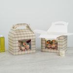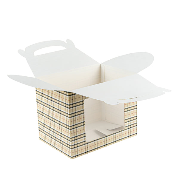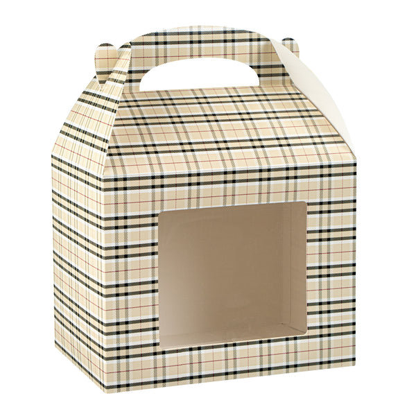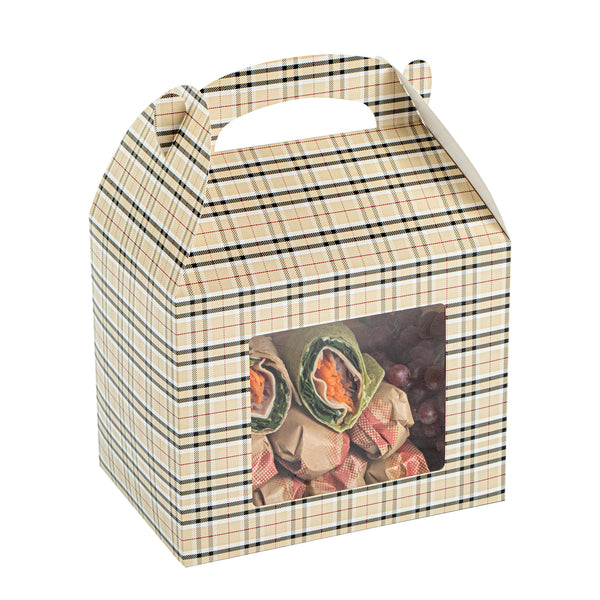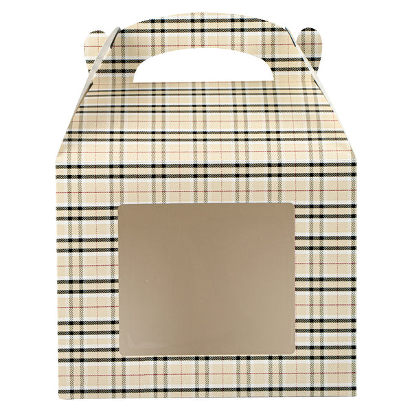 Enhance your packaging with these plaid paper gable boxes designed for effortless presentation. The Bio Tek Plaid Paper Gable Boxes / Take Out Containers feature a clear plastic window that highlights your delicious treats, making them instantly visible to customers. A reliable built-in handle ensures easy portability, allowing guests to carry their orders with ease. With a freezer-safe design, these versatile containers enable the storage of baked goods and desserts without compromising quality. Measuring 10 inches by 7 inches by 8 inches, they are an excellent fit for bakeries, cafes, and catering professionals. Constructed from recyclable paper, they align with sustainable operations while offering a polished look. Choose these plaid favor boxes to combine functionality with style. Sold in a 100 count box.