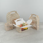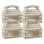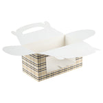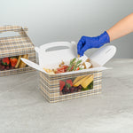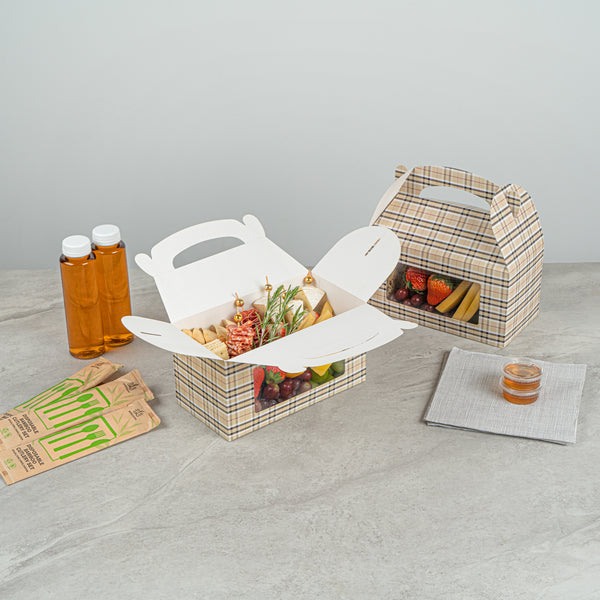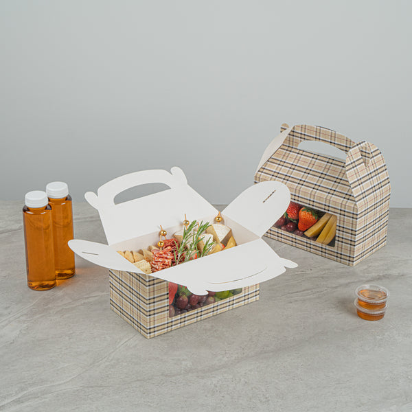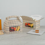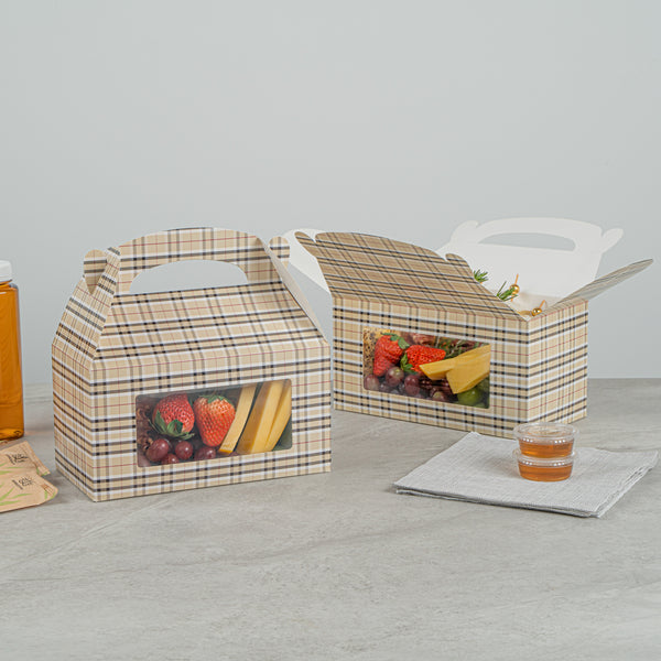Enhance your presentation with appealing product visibility. Bio Tek Plaid Paper Gable Boxes / Take Out Containers, measuring 9.5 inches in length and crafted from sturdy paper, feature an integrated plastic window that provides an enticing sneak peek of your offerings to attract customers. The built-in handle of these gable gift boxes ensures comfortable transportation, making them ideal for catering events or bakery deliveries. Additionally, their freezer-safe design allows you to efficiently store treats, maintaining their freshness until they are ready to be served. These kraft paper favor boxes are not only stylish but also recyclable, supporting your commitment to sustainability. The versatile 9.5 inches by 5 inches by 5 inches dimensions make them ideal as tan cardboard gable boxes, suitable for a variety of goodies, from baked goods to gourmet snack. Sold in a 25 count box.