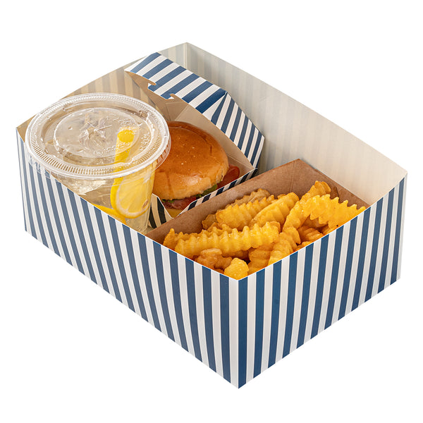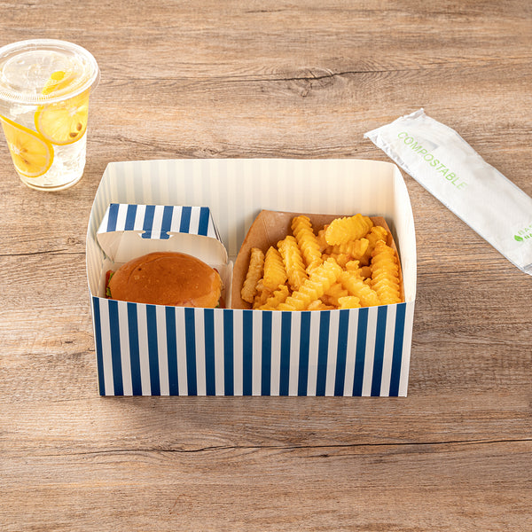 Serve your takeaway sandwiches with our Bio Tek Rectangle Blue and White Stripe Paper Sandwich / Burger Open Trays. These baked goods containers are designed with a single opening that allows easy eating directly from the tray while on the go. The blue and white stripe design of these burger trays brings style, making mealtime more enjoyable. These paper open trays have grease-resistant PE lining to preserve their high-quality appearance by preventing any oil seepage which otherwise could create an unattractive look. Constructed from superior paper, these movie snack trays offer a firm base and can hold a hefty amount of food while preventing unfortunate spills. Biodegradable and commercially compostable, these rectangle trays support eco-friendly disposal. Each paper food tray is shipped flat for compact storage and can be easily assembled for an efficient food serving at foodservice establishment. These sandwich trays measure 8.5 inches in length by 6 inches in width by 3.5 inches in depth. Sold in a 100 count box. These items will only degrade outside of the traditional solid waste stream.