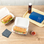Designed for convenience, these paper clamshell containers are disposable for easy and quick cleanup. Enjoy a meal and toss them when done.
