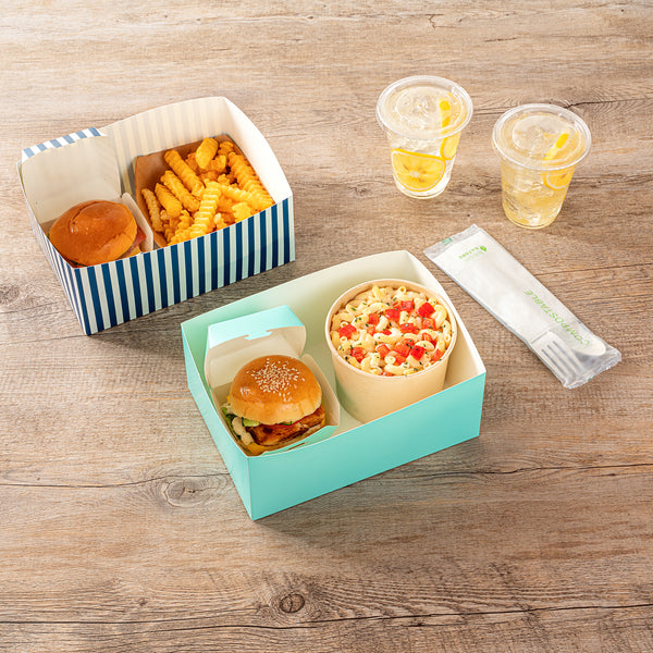 Ensure your takeaway burgers are perfectly contained using our Bio Tek Rectangle Turquoise Paper Sandwich/Burger Open Trays. Featuring a convenient open structure, these turquoise food trays are perfect for comfortably enjoying sandwiches and burgers on the go. Designed with an attractive turquoise exterior, these open trays enhance the aesthetic of your dishes, providing an element of fun to your food service. These burger trays feature PE lining and protect against unsightly oil stains, maintaining their high-quality appearance thanks to their grease-resistant properties. Delivered flat for convenience, these recyclable sandwich trays ensure compact storage in your cafe, food truck, or diner. These unique burger and sandwich trays measure 8.5 inches in length, 6 inches in width, and 3.5 inches in depth. Sold in a 100 count box.