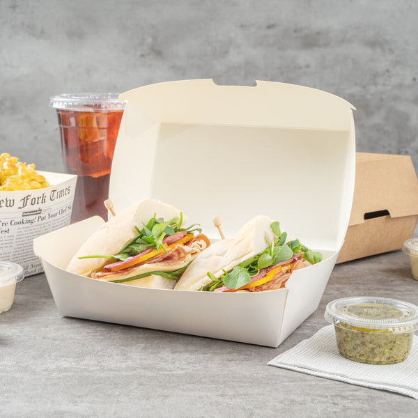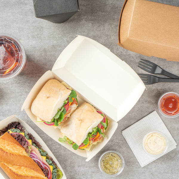 Designed for convenience, these paper clamshell containers are disposable for easy and quick cleanup. Enjoy a meal and toss them when done.