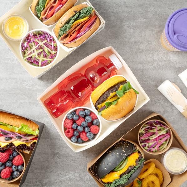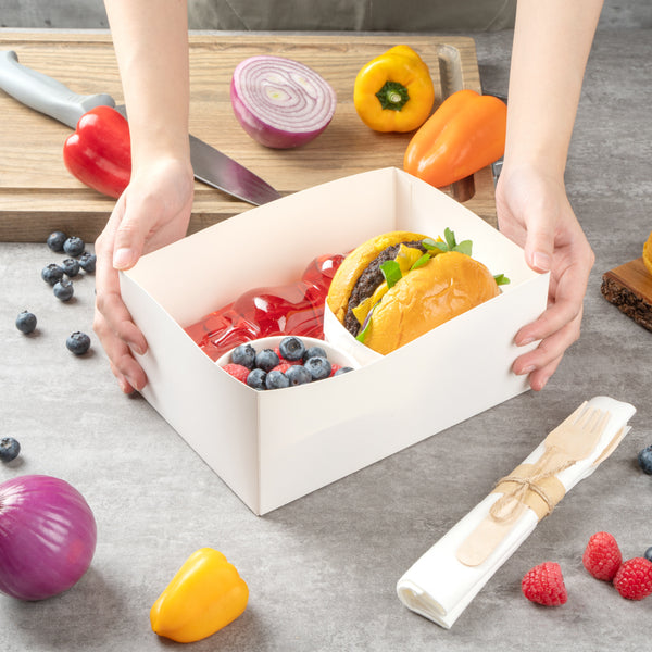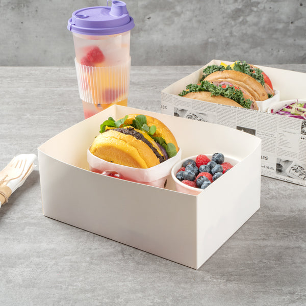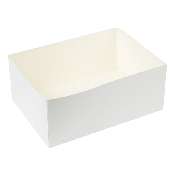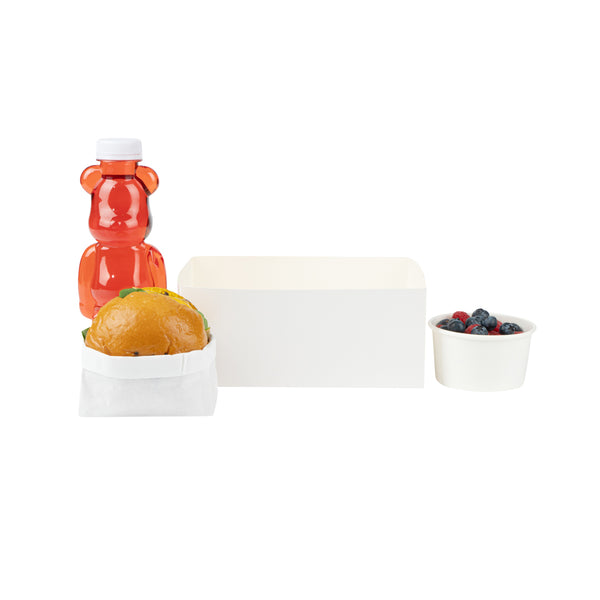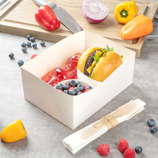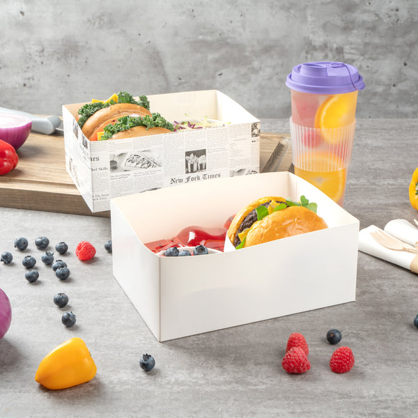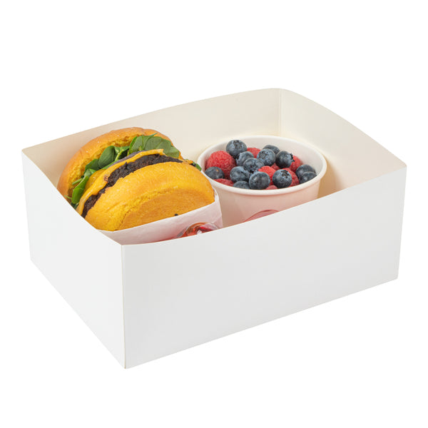 Quickly assemble burger and fry combinations using our Bio Tek Rectangle White Paper Sandwich / Burger Open Trays. Crafted with premium paper, these burger trays are sturdy and lightweight to comfortably hold hefty meals. With an open-face design, these paper burger trays make foods easy to access for customers. The sturdy base of these paper trays provides stability on tabletop surfaces to avoid spills. Great for coordinating with the rest of your takeout supplies, these burger trays have a stylish white finish. To quickly dispose of trays after use, these burger trays are recyclable. These paper burger trays measure 8.5 inches in length by 6 inches in width and 3.5 inches in height and can be filled with hot or cold foods. Sold in a 100 count box.