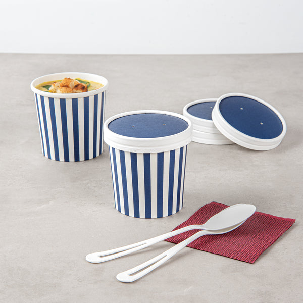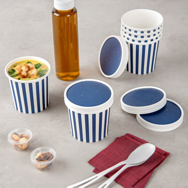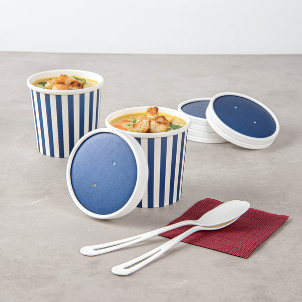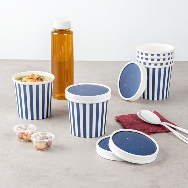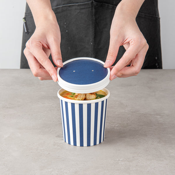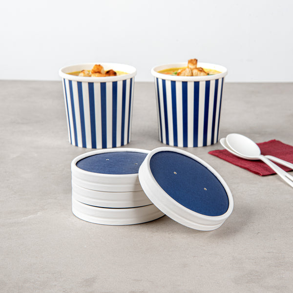 These disposable soup cup lids are available in various colors and prints to match the aesthetics and brand image of your foodservice establishment. Get your take out orders looking fun and fashionable!