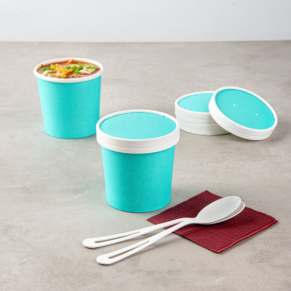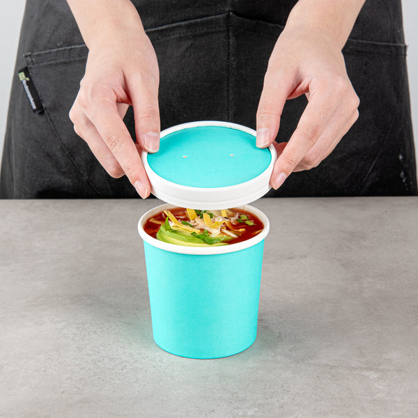 These disposable soup cup lids are available in various colors and prints to match the aesthetics and brand image of your foodservice establishment. Get your take out orders looking fun and fashionable!