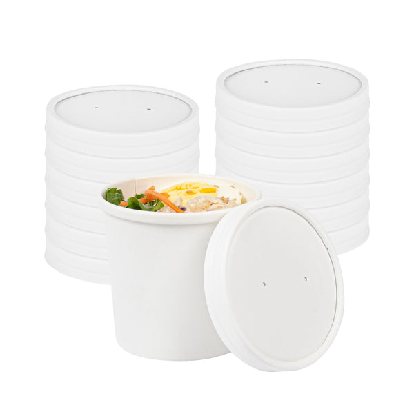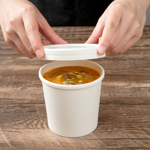 These tightly fastened paper lids perfectly seal in hot foods to avoid leaks and spills, reducing the risk of accidental messes and burns. Plus, they have raised rims so they can be stacked on top of each other.