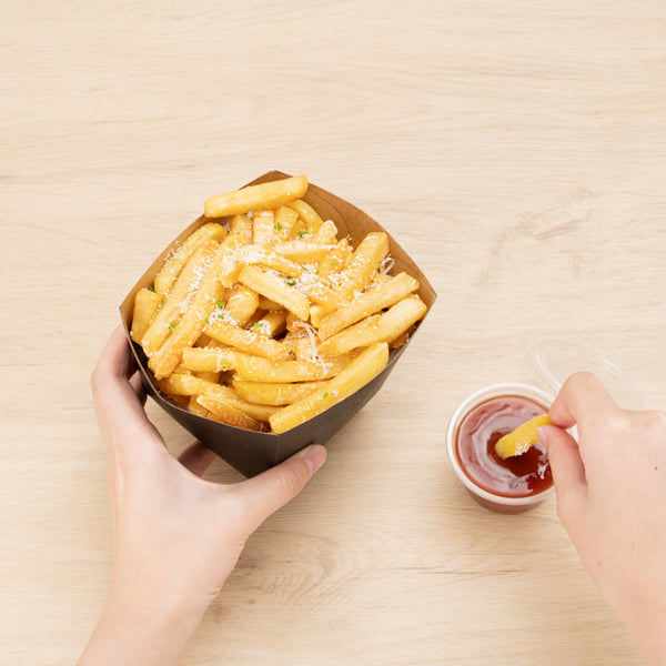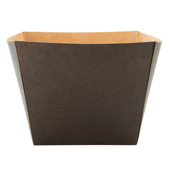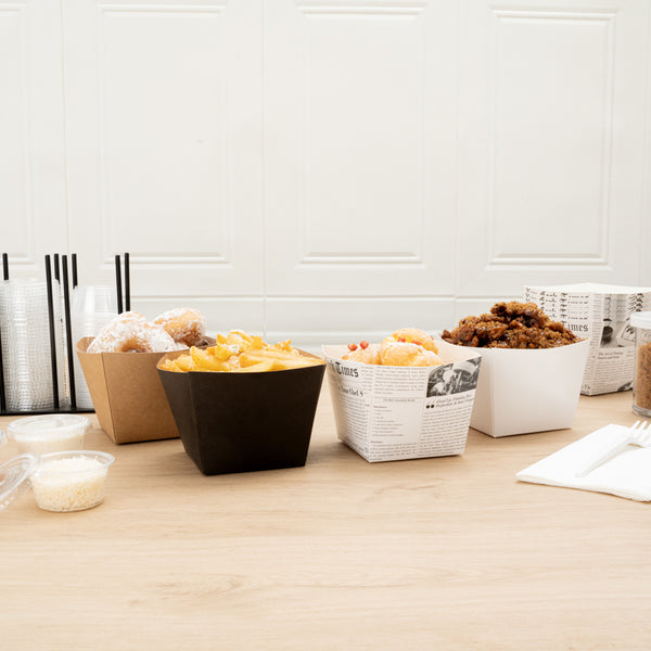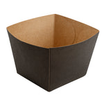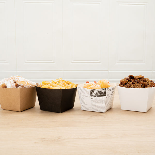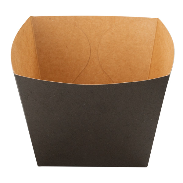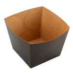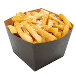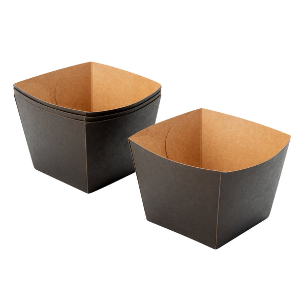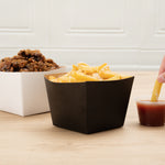 Put your customers' appetizers and sides in our snazzy Bio Tek Square Black Paper Snack Boxes. Featuring a hot and cold food-friendly design, you can serve everything from hot fries to cold nuts in these french fry boxes. These paper snack boxes are grease-resistant to prevent saucy or oily foods from seeping through and creating a mess. Crafted from recyclable paper, these snack boxes help reduce your impact on the planet. These paper snack boxes are constructed from sturdy, premium paper in order to hold hefty foods. The open-top of these paper french fry boxes makes sharing foods easy for customers. With an elegant black finish, these paper snack boxes add a touch of class to your food presentation. Equipped with a stackable design, these paper snack boxes are easy to store when not in use. Measuring 4.25 inches long by 3.25 inches tall, these paper boxes are ideal for french fries, mini donuts, and other dishes. Shipped in a 200 count box.