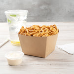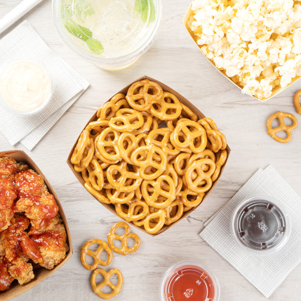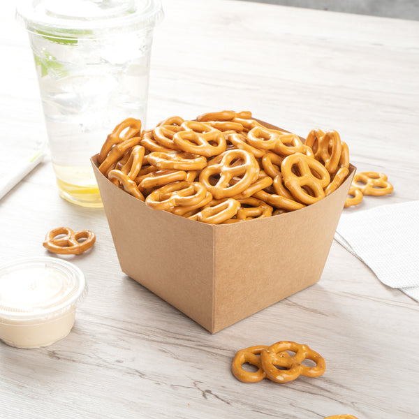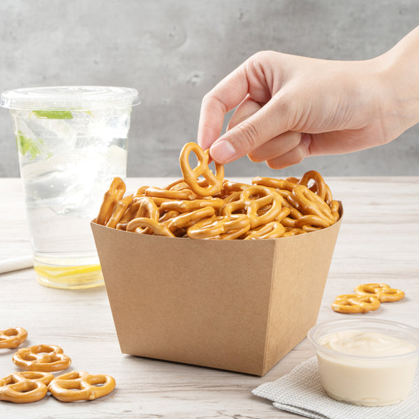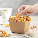 Designed for hot or cold food, these paper food boxes can hold pretzels, popcorn, or chicken wings. Serve guests with any type of snack.