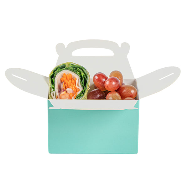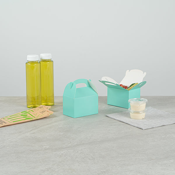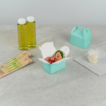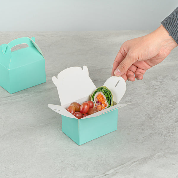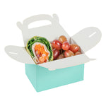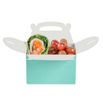 Enhance your presentation with charming turquoise packaging. Bio Tek Blue Paper Gable Gift Boxes offer a built-in handle for easy transport, making them ideal for catering and restaurants needing reliable gable gift boxes. Their freezer-safe design allows for the convenient storage of frozen treats, ensuring your desserts or snacks remain fresh until serving. With a delightful turquoise finish, these paper gift boxes add a touch of elegance to any event, perfect for those seeking stylish wedding favor boxes. Measuring 4 inches in length, 2.5 inches in width, and 2.5 inches in height, these boxes are crafted from paper, which is commercially Commercially composatble, recyclable, and biodegradable, supporting sustainable practices. Add these versatile and eco-friendly boxes to your packaging supplies to enhance your foodservice experience. Each order includes 100 Bio Tek Blue Paper Gable Gift Boxes.