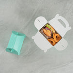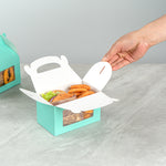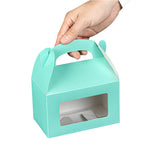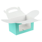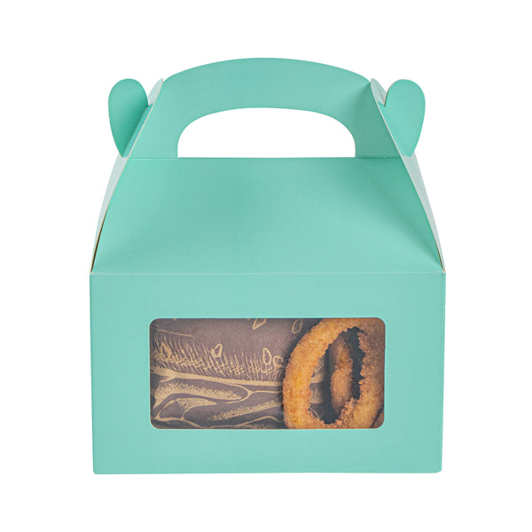 Enhance your food presentation with our Bio Tek Turquoise Paper Gable Boxes / Take Out Containers. These cardboard gift boxes feature a clear plastic window that provides an enticing sneak peek of your delicious creations, making them perfect for showcasing confections and baked goods. Designed with a built-in handle, these gable gift boxes allow for comfortable and secure transport, ensuring your treats reach their destination intact. Crafted from sturdy paper, these boxes are not only durable but also recyclable, supporting eco-conscious foodservice practices. With a convenient freezer-safe design, you can store desserts safely and maintain their freshness for later use. Measuring 6 inches in length, 3.5 inches in width, and 3.5 inches in height, these window gift boxes are ideal for a variety of small treats. Elevate your packaging experience today and highlight your culinary creations. Sold in a 100 count box.
