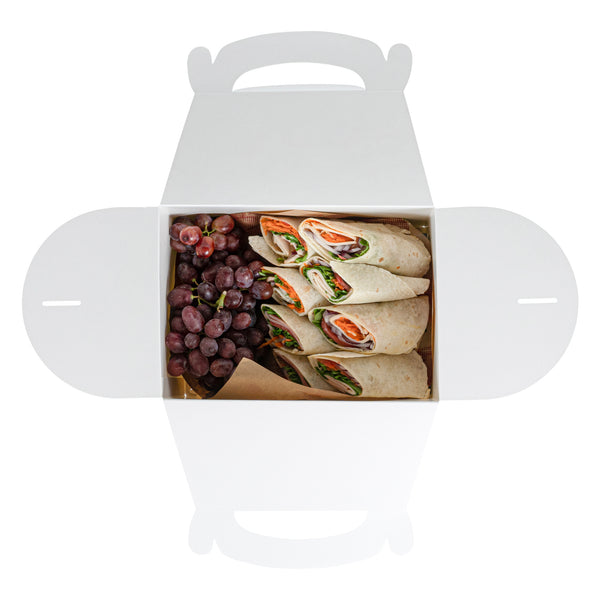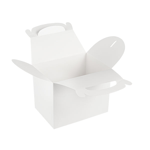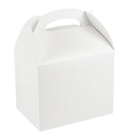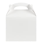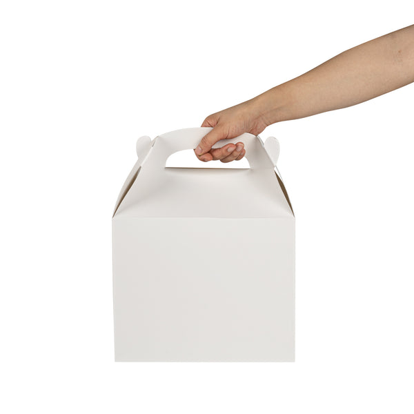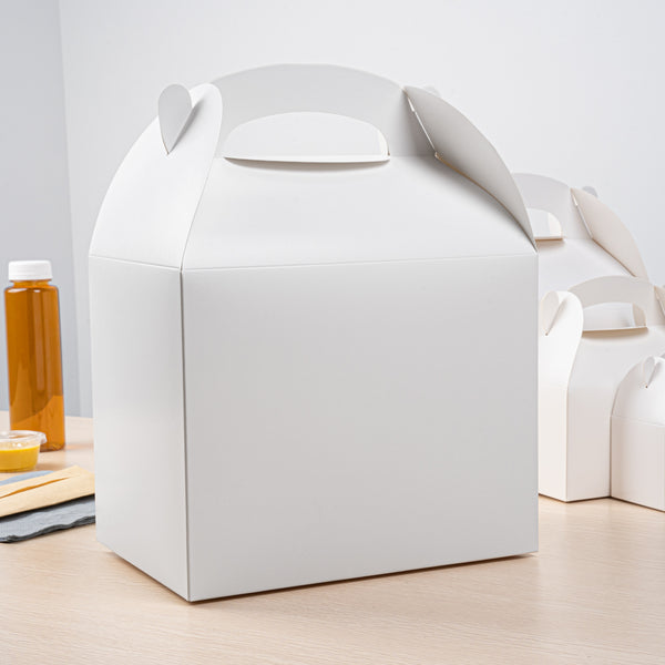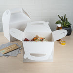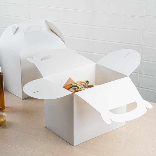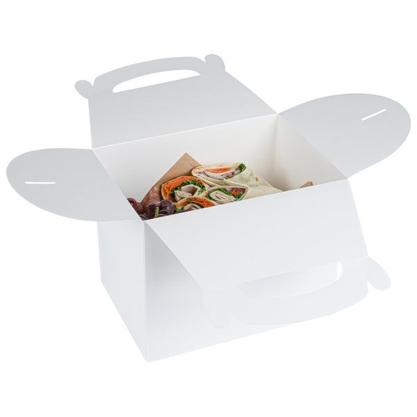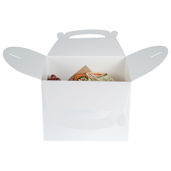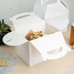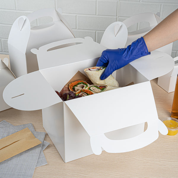 Elevate your food presentation with these white paper gable boxes. Bio Tek White Paper Gable Boxes / Take Out Containers feature an ergonomic built-in handle that simplifies carrying take out meals and baked goods. Their greaseproof lining resists oil absorption, keeping surfaces spotless and maintaining a professional look. With a freezer-safe design, these boxes provide convenient storage options for desserts, pastries, or savory dishes. Constructed from sturdy paper, they are versatile enough for use in bakeries, cafes, catering events, or as party favor boxes. Sized at 10 inches long, 7 inches wide, and 8 inches tall, they deliver ample space for a wide range of menu items. Use these white gable boxes to combine functionality with a polished appearance. Sold in a 25 count box.