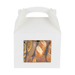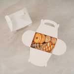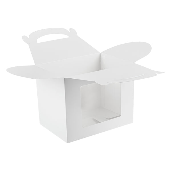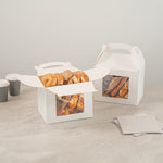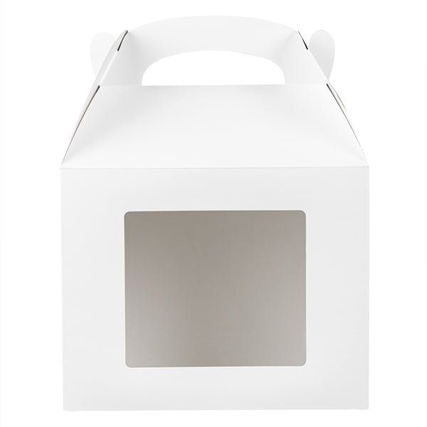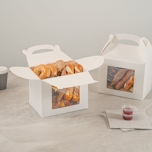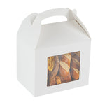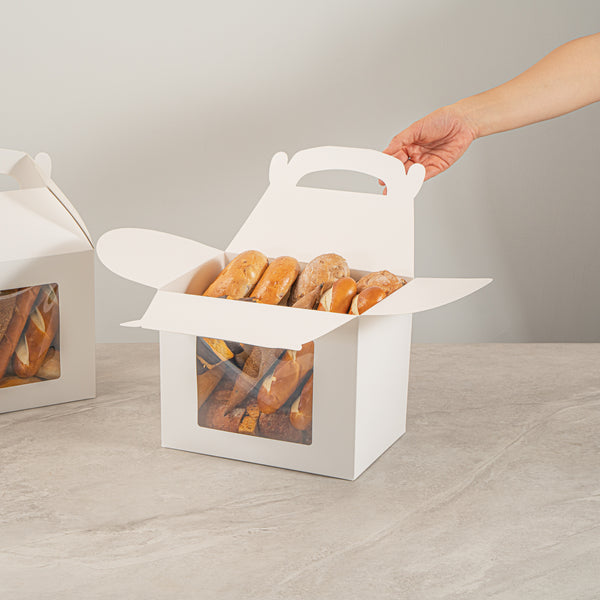 Package your treats with a clean, polished look. Bio Tek White Paper Gable Boxes / Take Out Containers feature a greaseproof lining that resists oil absorption, maintaining a neat and professional appearance with every use. Designed with a transparent plastic window, they beautifully showcase baked goods, desserts, or favors while helping customers make quick selections. At 10 inches long, 7 inches wide, and 8 inches tall, these boxes provide ample space for a variety of items, making them ideal for cafes, bakeries, and catering services. Their sturdy built-in handle ensures easy carrying, streamlining both customer pickup and staff handling. Constructed from recyclable paper, they combine function with sustainability for eco-conscious businesses. Sold in a 25 count box.