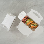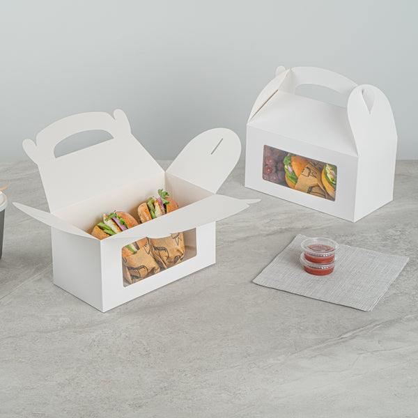 Transport food orders securely with greaseproof protection. Bio Tek White Paper Gable Boxes / Take Out Containers are designed with a greaseproof lining that prevents oils from seeping through, making them perfect for handling fried foods without leaks. These cardboard gift boxes feature an integrated plastic window that provides an enticing preview of sandwiches and snacks, enhancing the presentation and appeal of your offerings. With a built-in handle, these wedding favor boxes make carrying large orders comfortable and convenient, ideal for catering events. Each box measures 9.5 inches in length by 5 inches in width and height, crafted from recyclable paper, ensuring environmentally friendly disposal. Upgrade your food packaging with these cold food friendly, freezer-safe, and hot food friendly boxes that effortlessly combine practicality and style. Sold in a 100 count box.