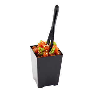 Elegantly serve finger foods with our Bambuddha Black Bamboo Mini Forks. Made of bamboo, these disposable forks are sturdy and perfect for everyday use. Ideal for piercing through and serving bite-sized morsels, desserts, or other savory fares, these bamboo utensils make for fine disposable flatware in any restaurant setting. Featuring 2 prongs, these biodegradable bamboo forks make picking up small meatballs or bite-sized appetizers easy. To save time on cleaning up after events, these mini forks are disposable. The sustainable construction of these bamboo utensils makes them commercially compostable. These mini bamboo forks offer a contemporary twist to traditional bamboo utensils with their natural finish, adding a touch of sophistication to your table setting. Each black bamboo fork measures 3.5 inches in length. Sold in a 100 count box.