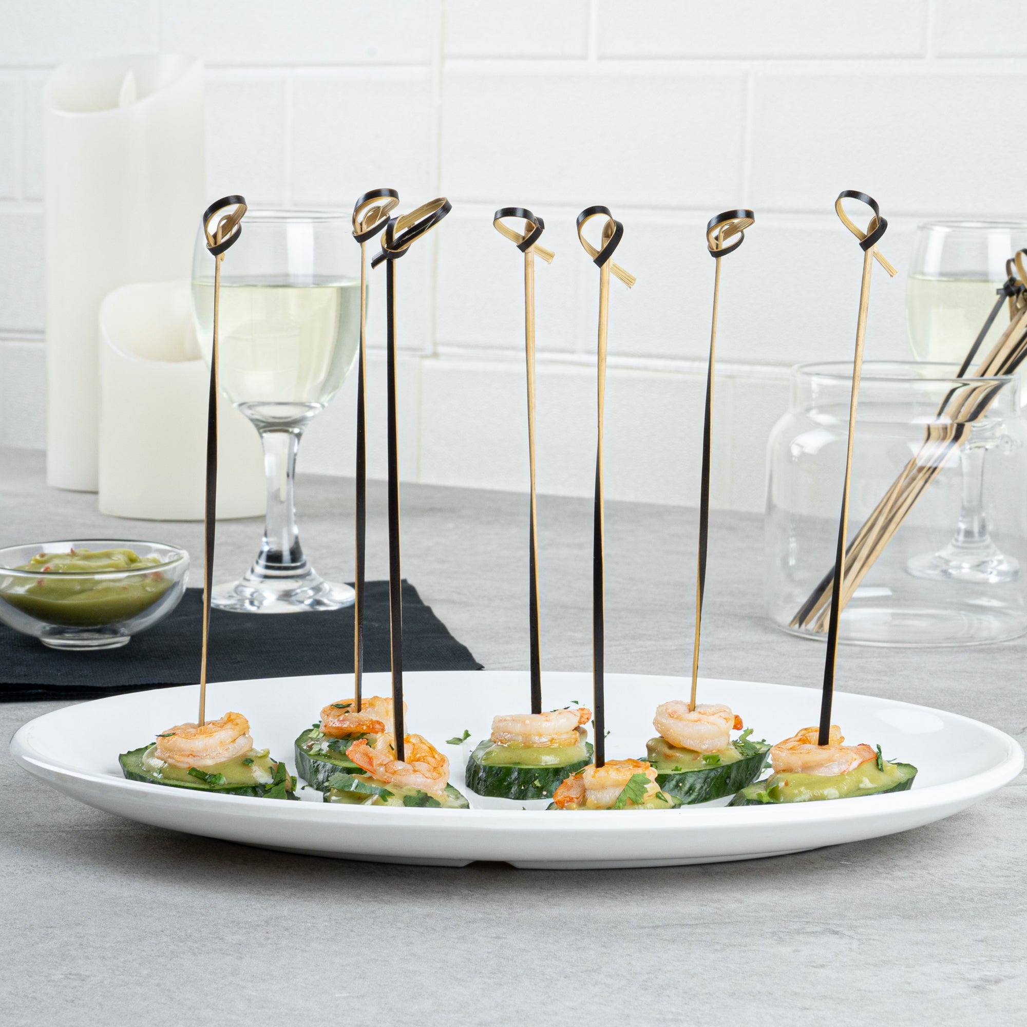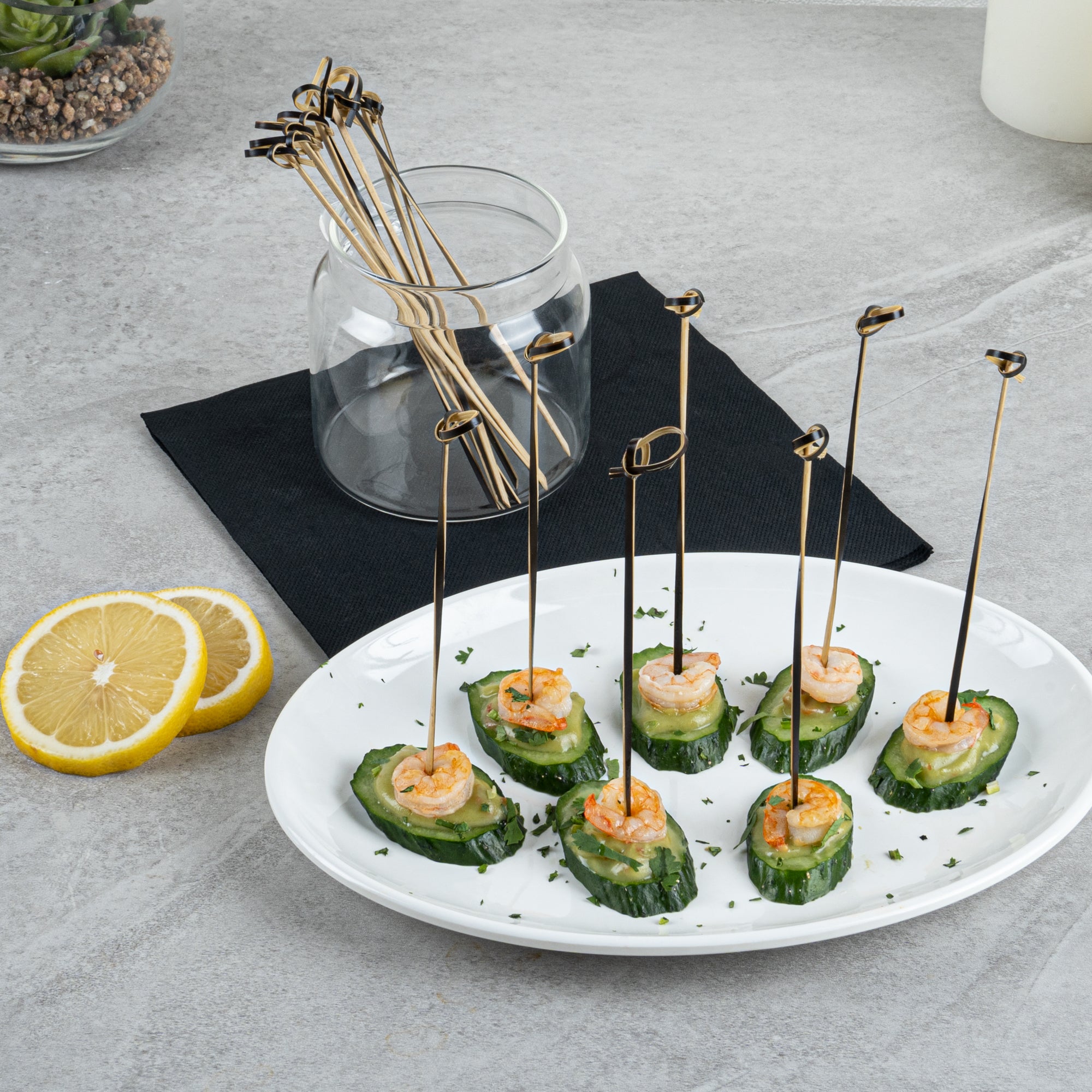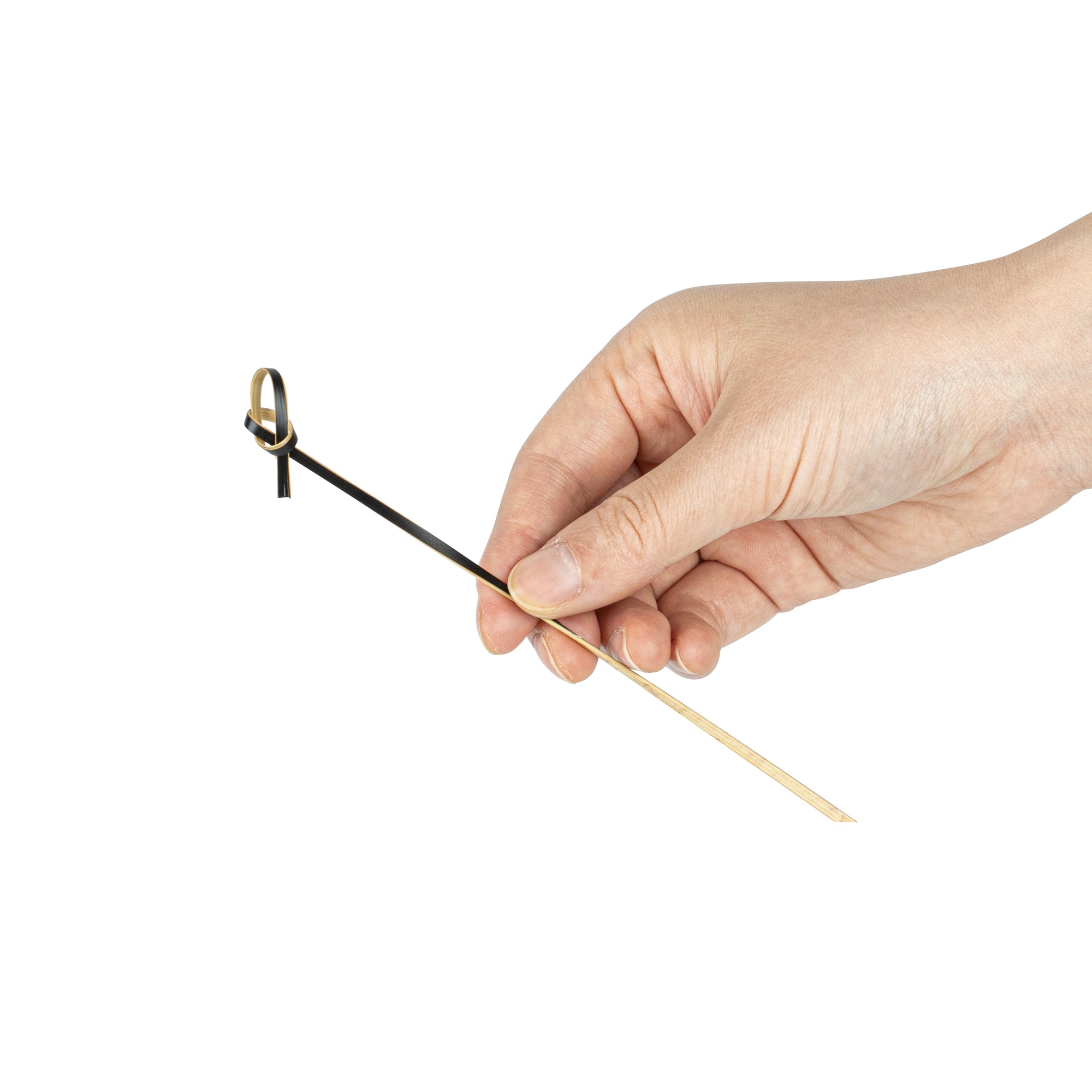 Bring a fun twist to your culinary presentations with our Pixy Black Bamboo Twisted Knot Picks. These bamboo picks, with their artistic knot design, will appeal to those seeking a unique way to showcase their gastronomic skills. Made from robust bamboo, these biodegradable fruit picks are durable and reliable, capable of withstanding any foodservice or catering challenge. With a pointed end, these commercially compostable food picks can effectively secure various kinds of food items for ease of serving. Suitable for warm and chilled dishes, these stylish picks are perfect for soirees, banquets, and other dining occasions. Featuring a convenient disposable design, these cocktail picks simplify the post-event cleaning process. Each skewer measures 6 inches in length, adding a stylish touch to your upcoming gatherings. Sold in a 1,000 count box.