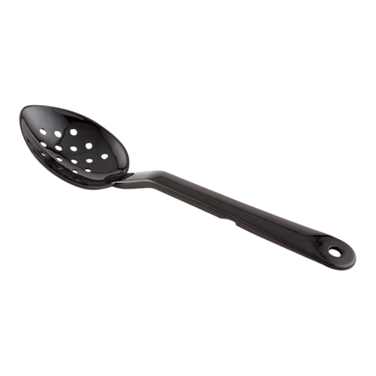 Accentuate your buffets and catering events with this Cater Tek Catering Service Perforated Spoon. Measuring 11 inches long, this plastic serving spoon is the perfect size for serving alongside appetizers, side dishes, salads, entrees, desserts, and more! Its durable plastic construction is conveniently dishwasher-safe, and its polished black finish adds an elegant touch to any setting. Equipped with a built-in resting notch, this perforated catering spoon's handle prevents it from slipping into buffet trays and serving bowls. Use this perforated serving spoon for straining and serving messier foods to keep plates dry and mess-free. Although intended for reuse, and conveniently dishwasher-safe, you could also use these plastic spoons as disposable serving spoons at corporate luncheons and other off-site catered events. This perforated plastic service spoon is shipped in a 1 count box.