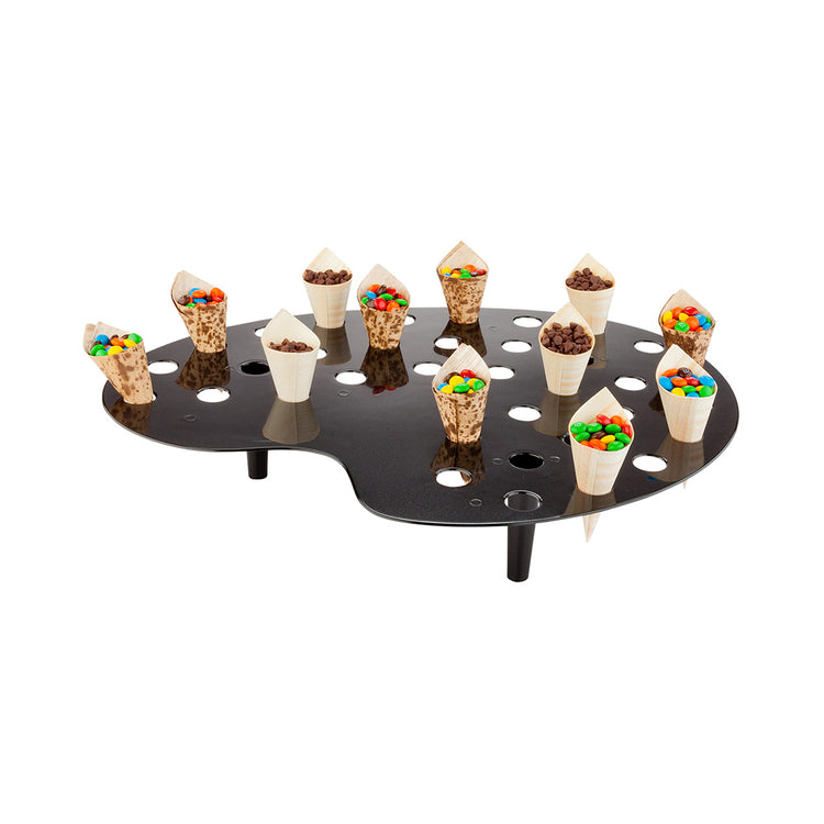 Introduce your customers to an elegant way to display their treats with our Cone Tek Black Plastic Palette Cone Holders. These artist palette-shaped cone holder trays securely hold an assortment of 35 mini waffle cones. Featuring 3 slightly recessed legs, these mini food cone stands create an illusion of floating when positioned correctly. Made with premium plastic, these cone holders can also be kept as an attractive centerpiece. These durable, plastic cone stands provide stability for displaying mini appetizers or dessert cones. Featuring a lightweight construction, these plastic cone display stands are easy to move and rearrange. These reusable black plastic cone holders provide a stylish solution for any shop, bakery, or catering event. The sleek, black finish of these plastic palate cone holders adds a touch of sophistication while showcasing your fares. Measuring 16 inches in length by 13 inches wide, these spacious cone holder trays give each cone its own slot for optimum visibility, allowing customers to view many flavor options. Sold in a 4 count box.