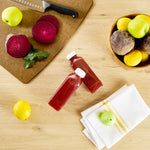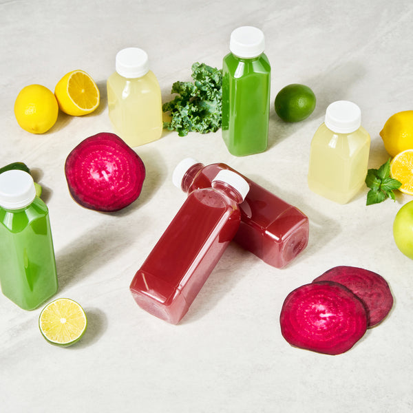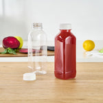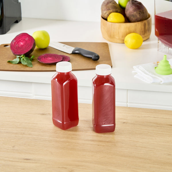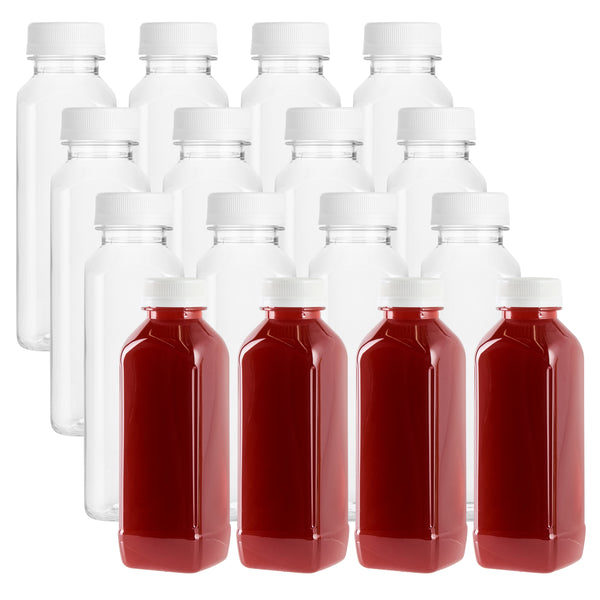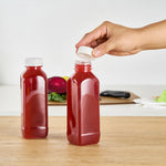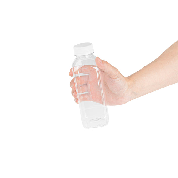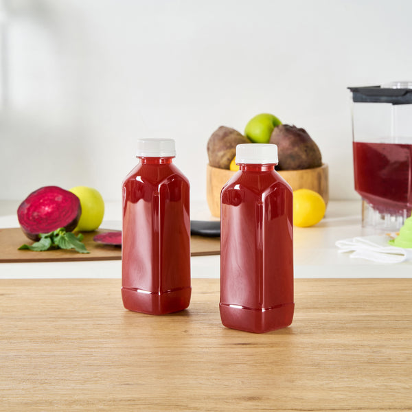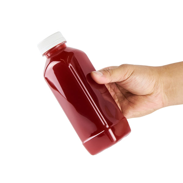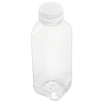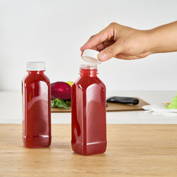 Easily package and sell grab-and-go beverages with these Bottle Tek 16-Ounce Square Clear Plastic Cold Pressed Juice Bottles. Made from premium plastic, these juice bottles are recyclable and food safe! Each of these high-quality plastic juice bottles is equipped with a twist-on safety cap that prevents leaks and locks in freshness to ensure your juices are always delicious and ready for sale. Featuring a tamper-evident cap and a stylish square shape, these plastic juice bottles are a professional way to serve juices, lemonades, smoothies, and other refreshing beverages at all types of foodservice establishments. These square juice bottles measure 7.1 inches in height by 2.25 inches in width and can contain up to 16 fluid ounces. These plastic juice bottles with twist-off tops can easily be affixed with customized stickers or labels to take your beverage service to the next level. Each order will contain 100 clear plastic 16-oz juice bottles and 100 white safety caps.