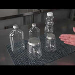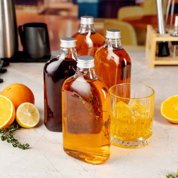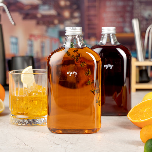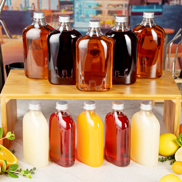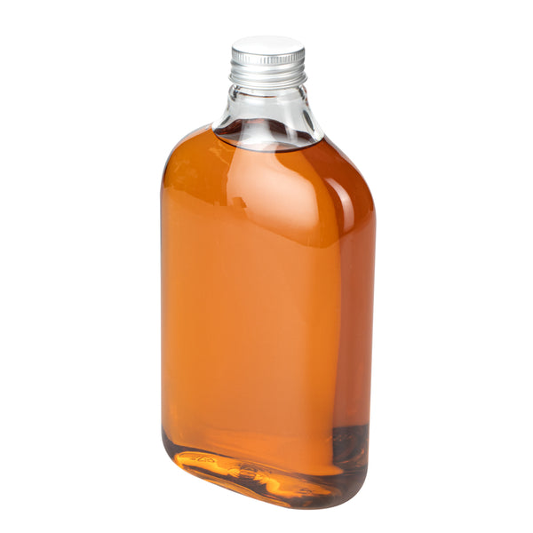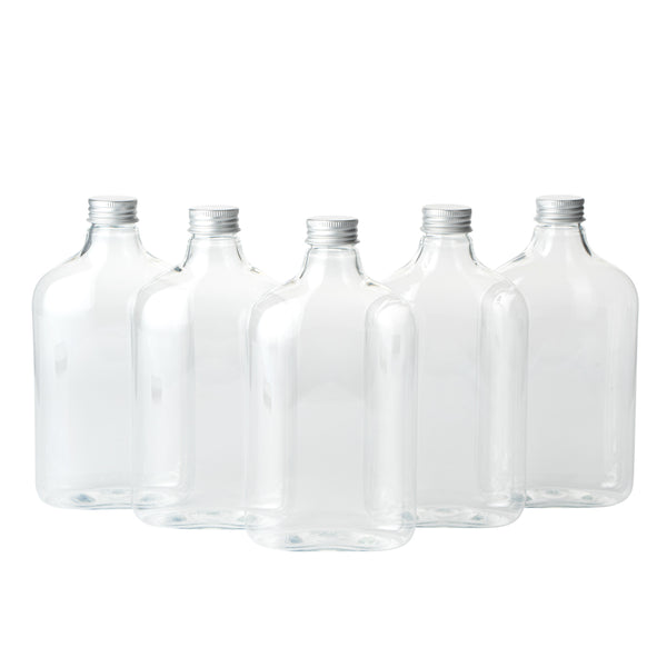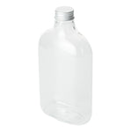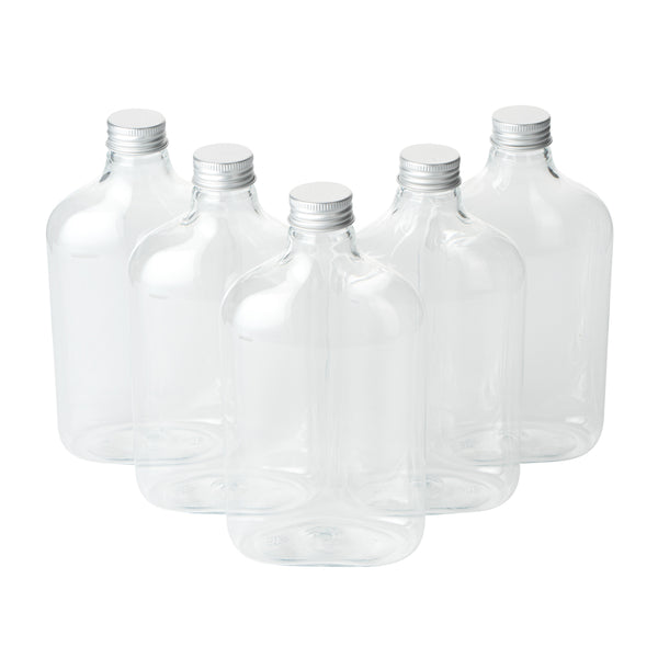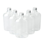 Store your condiments in our Bottle Tek 17-ounce Clear Plastic Flask Containers. With a classic flask design, these square bottles are perfect for bottling up spices, oil, or sugars for easy transport to your catered events. These plastic bottles come with aluminum lids to keep the contents inside from leaking out and creating a mess. The crystal clear finish of these plastic flasks makes it easy to identify ingredients or sauces so you won't have to label each bottle. Made from premium PET plastic, these liquor bottles are recyclable to shorten the cleaning time at your restaurant or catered event. Holding up to 17 ounces, these juice bottles measure 3.75 inches long by 2 inches wide by 7 inches tall. Sold in a 100 count box.