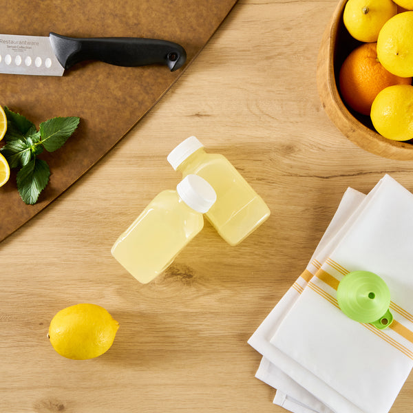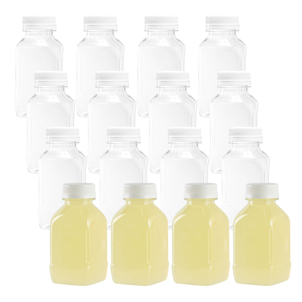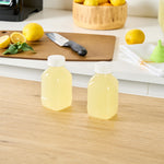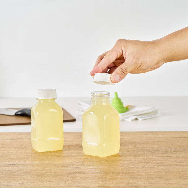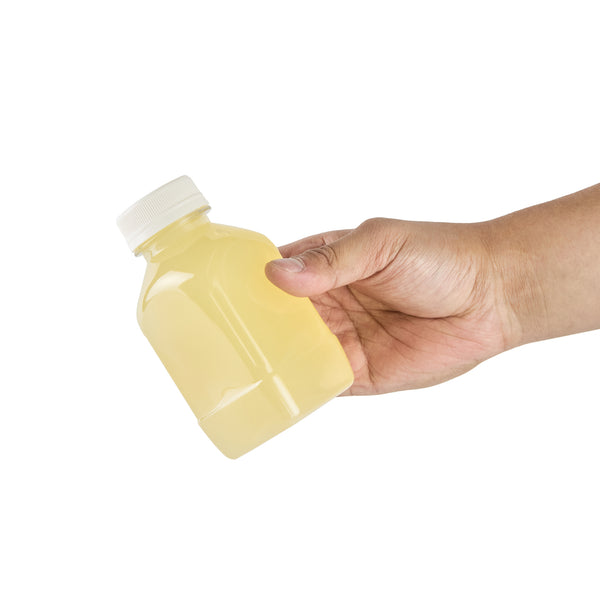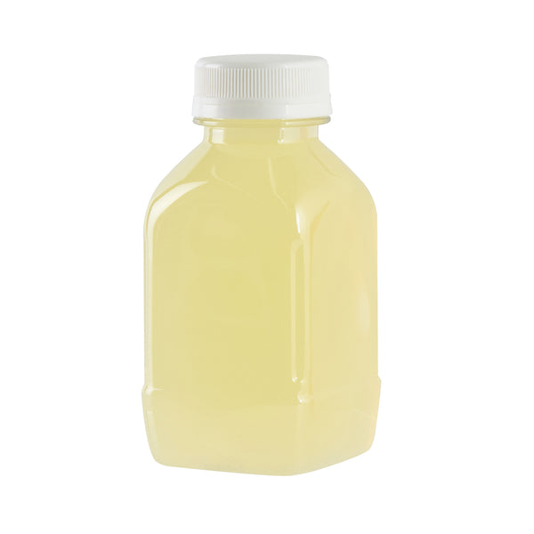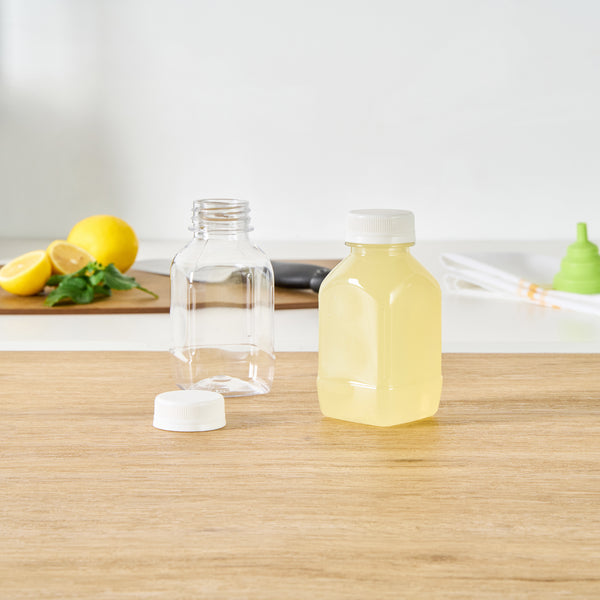 Securely package and sell your fresh-squeezed juices with our Bottle Tek 8-ounce Square Clear Plastic Cold Pressed Juice Bottles. These small juice bottles are crafted from high-quality plastic and robust, ensuring your beverages stay fresh and securely stored. Holding up to 8 ounces, these plastic juice bottles are ideal for packaging cold-pressed juices, fresh lemonades, smoothies, or cold-brewed coffees. These clear plastic bottles are equipped with twist-on safety caps that create a tamper-evident and airtight seal to ensure your beverages are always fresh and ready for retail sale. The clear finish of these plastic bottles beautifully showcases the color of the beverages, while the white finish of the plastic caps provides a clean and contrasting touch, enhancing the overall aesthetic appeal. For an easy cleanup, these plastic bottles with caps are disposable. These disposable bottles measure 2.25 inches in length by 2.25 inches in width by 4.75 inches in height and have a capacity of 8 ounces. Shipped in a 100 count box.
