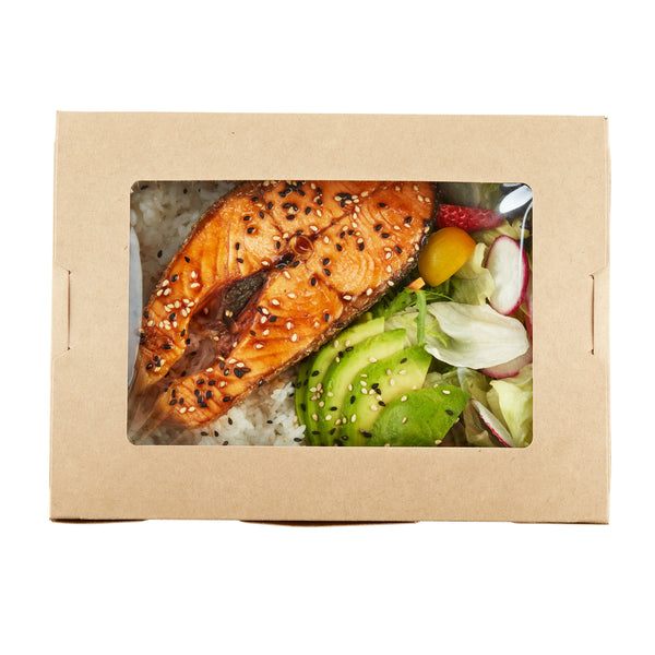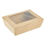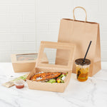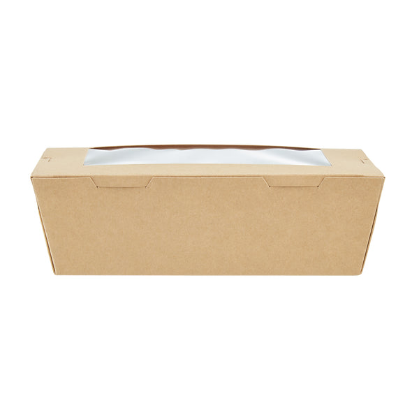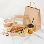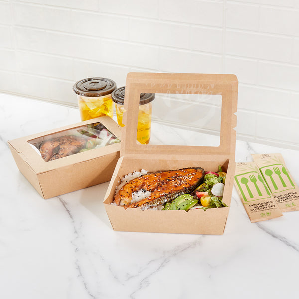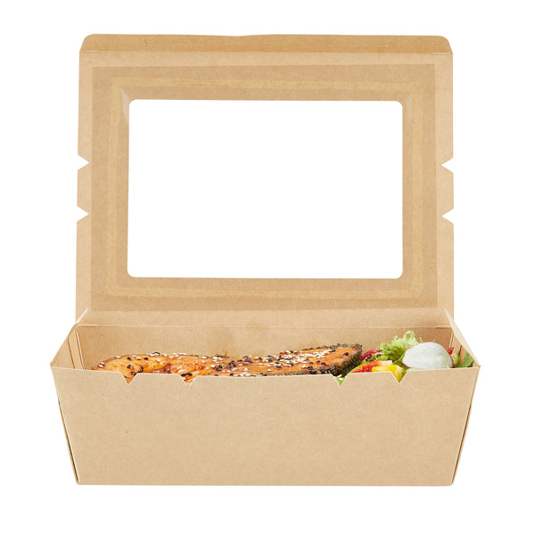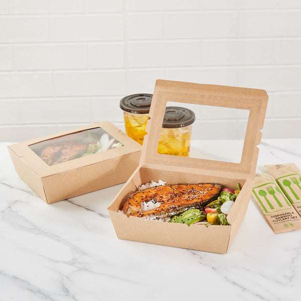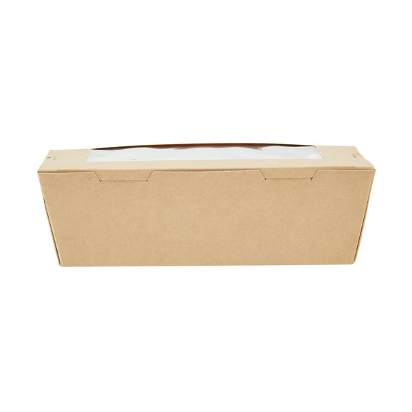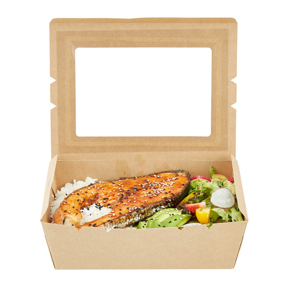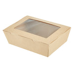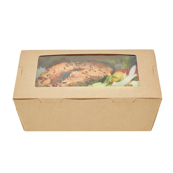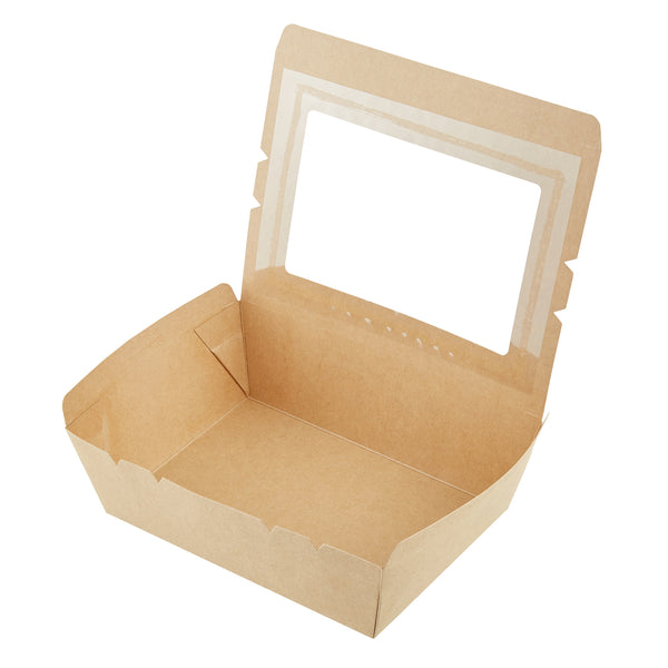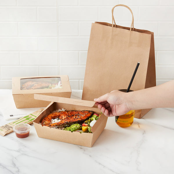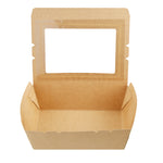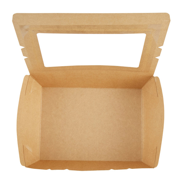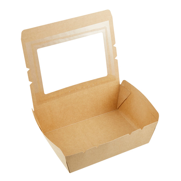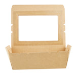 Pack food stylishly with our Cafe Vision 71-ounce Kraft Paper Large Take Out Containers. These carry out containers are equipped with 4 hinge locks that create a secure seal, ensuring quick and reliable packaging for both take out and delivery services. With a clear plastic window, these takeaway containers allow your staff to easily identify contents for efficient organization. The grease-resistant PE liner in these take out boxes prevents oil or saucy leaks, providing a neat and pleasant dining experience. Crafted from premium paper, these to go boxes are perfect for securely packing both hot and cold food items. For those looking to store leftovers, these take out food containers are freezer-safe. The kraft finish of these disposable to go containers adds a stylish touch to your take out orders. After use, these paper take out containers are disposable and can be discarded easily, making cleanup a breeze. Ideal for eco-conscious establishments, these recyclable paper boxes for food are a sustainable choice. These takeaway boxes measure 8.75 inches in length by 6.5 inches in width by 2.5 inches in height and can hold up to 71 ounces, making them spacious and practical. Sold in a 200 count box.