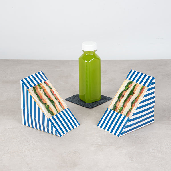 Make your products stand out on the shelves with our Cafe Vision Triangle Blue and White Stripe Paper Large Sandwich Boxes. The triangular design of these premium sandwich boxes allows for efficient use of space, fitting sandwiches perfectly inside it. Constructed of high-quality paper material, these sandwich boxes are durable and don't lose their integrity during delivery. Featuring a small transparent window, these grease-resistant sandwich boxes showcase freshly made sandwiches, enticing customers and highlighting your quality ingredients. Easily fitting multiple half-cut sandwiches, these takeaway sandwich boxes are ideal for quick service and delivery. Disposable and lightweight, these sandwich containers reduce mess and make cleanup a breeze. Measuring 4.75 inches in length by 4.75 inches in width by 3.25 inches in height, these spacious paper sandwich boxes securely contain your generously portioned sandwiches. Sold in a 25 count box.