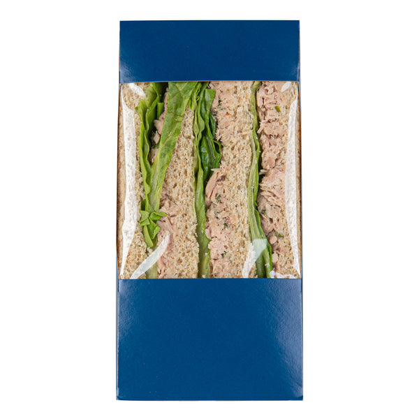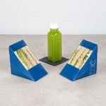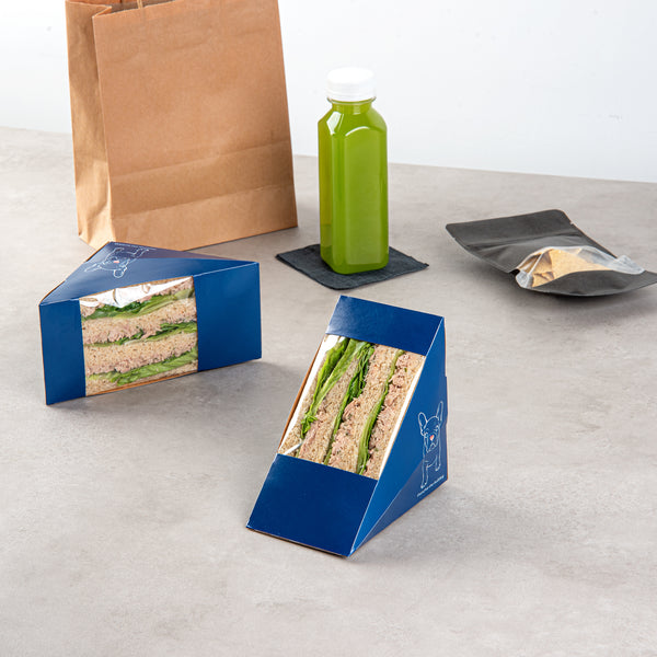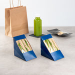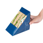 Preserve the delicious taste and texture of your sandwiches with our Cafe Vision Triangle Frenchie Paper Large Sandwich Boxes. The triangular design of these sandwich delivery boxes allows for efficient use of space and an eye-catching presentation, perfect for impressing your customers. Constructed from high-quality paper material, these sandwich boxes are durable and do not collapse. Featuring a small transparent window, these grease-resistant sandwiches showcase your sandwiches while keeping them securely contained. Easily fitting multiple half-cut sandwiches, these sandwich takeaway boxes are ideal for deliveries and grab-and-go options. Lightweight and disposable, these take out boxes can be handled with ease for quick serving and then be disposed after. These Frenchie design paper sandwich boxes give your packaging an attractive appearance. Measuring 4.75 inches in length by 4.75 inches in width by 3.25 inches in height, these boxes compactly contain sandwiches while occupying minimal space. Sold in a 200 count box.