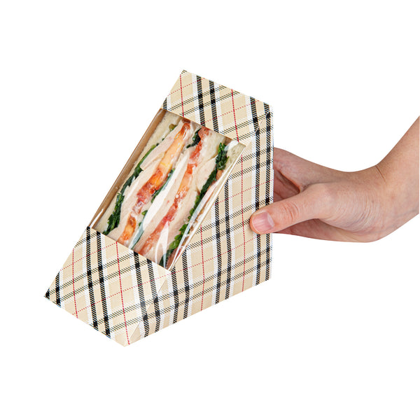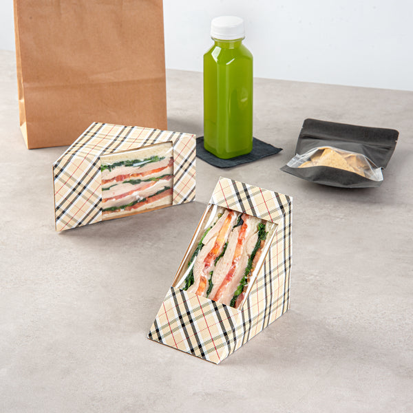Enhance customer convenience with our Cafe Vision Triangle Plaid Paper Large Sandwich Boxes. These sandwich containers are made from premium paper material that is durable and doesn't lose its structural integrity. Featuring a transparent window, these grease-resistant sandwich boxes allow customers to view the delicious fillings inside while maintaining freshness, making them efficient for deliveries. Triangular in shape, these paper sandwich boxes easily fit many half-cut sandwiches and are ideal for grab-and-go restaurants. These disposable sandwich containers make cleaning up a breeze. Lightweight yet sturdy, these paper sandwich boxes can be handled with ease while transporting. These Plaid paper sandwich boxes give an upscale look to your restaurant's packaging. Measuring 4.75 inches in length by 4.75 inches in width by 3.25 inches in height, these paper sandwich boxes are perfectly sized to showcase your sandwiches. Sold in a 25 count box.